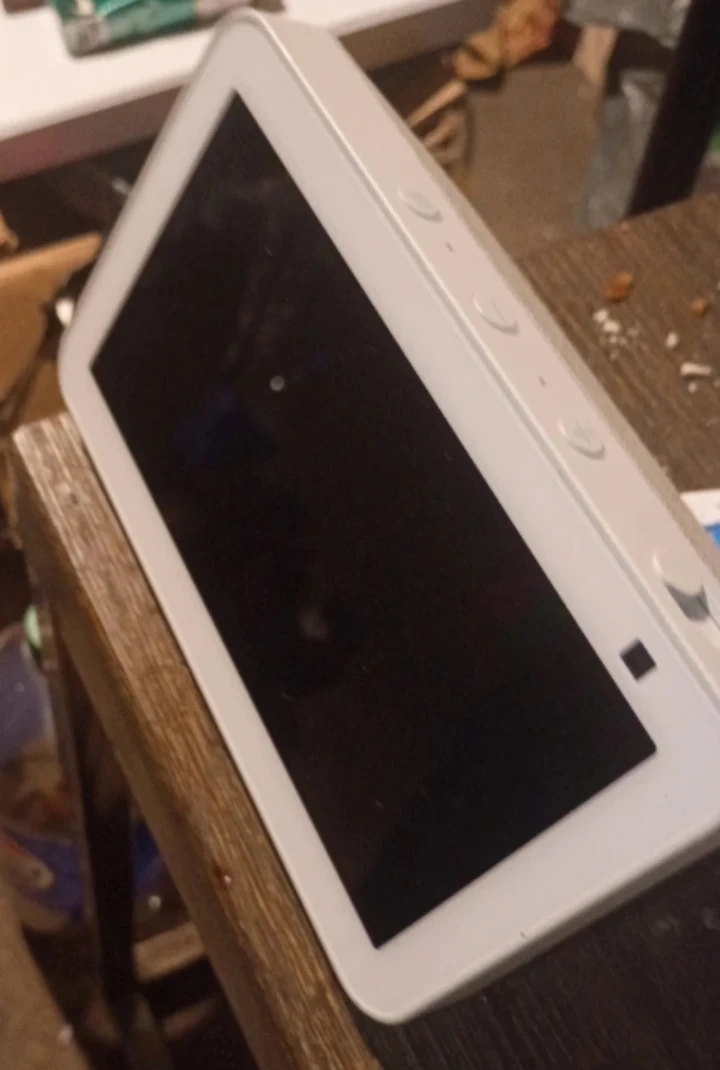 This is an Amazon Echo Show 8 smart display. It's white and has a touchscreen. Includes Amazon power adapter.