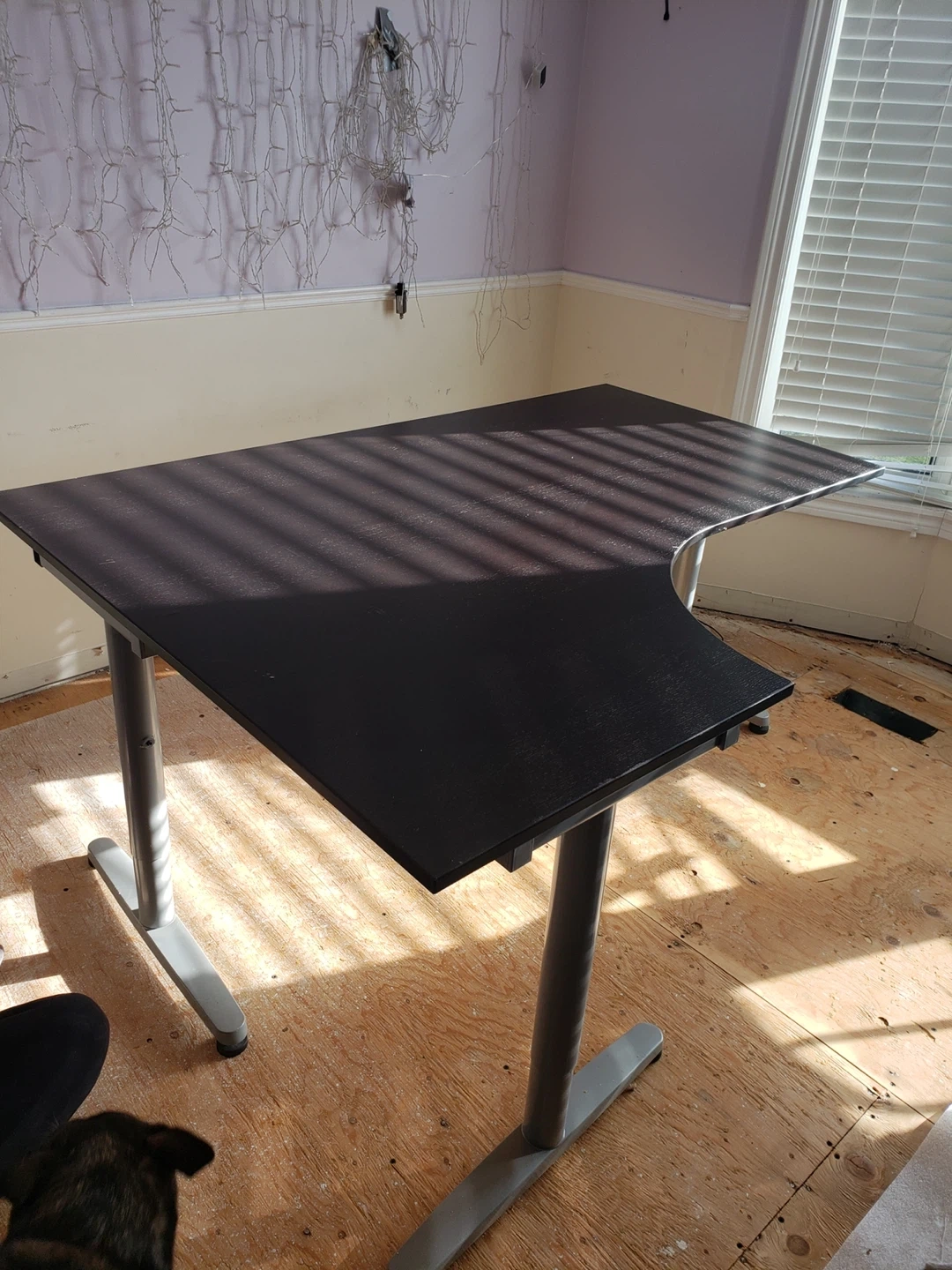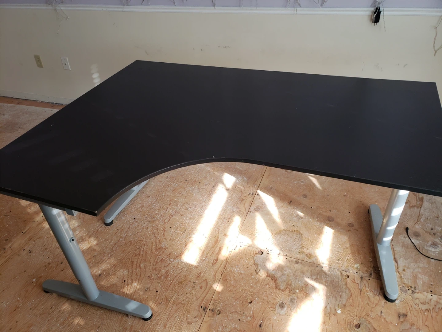 This L-shaped desk offers a spacious work surface. It's finished in black with silver metal legs. It's a sturdy, heavy desk for your home office. From IKEA.