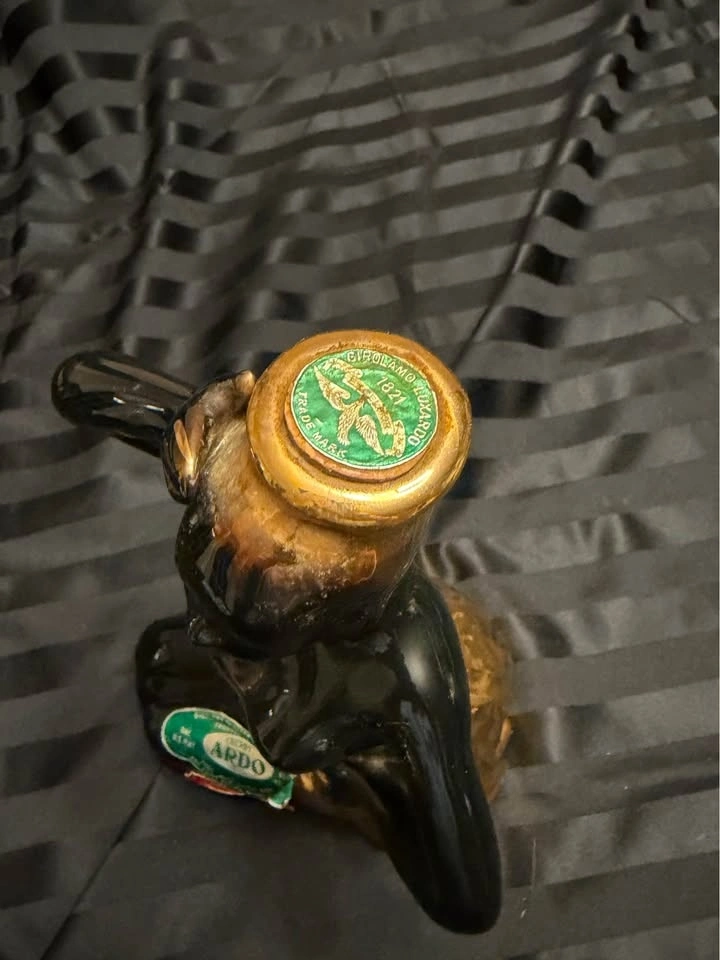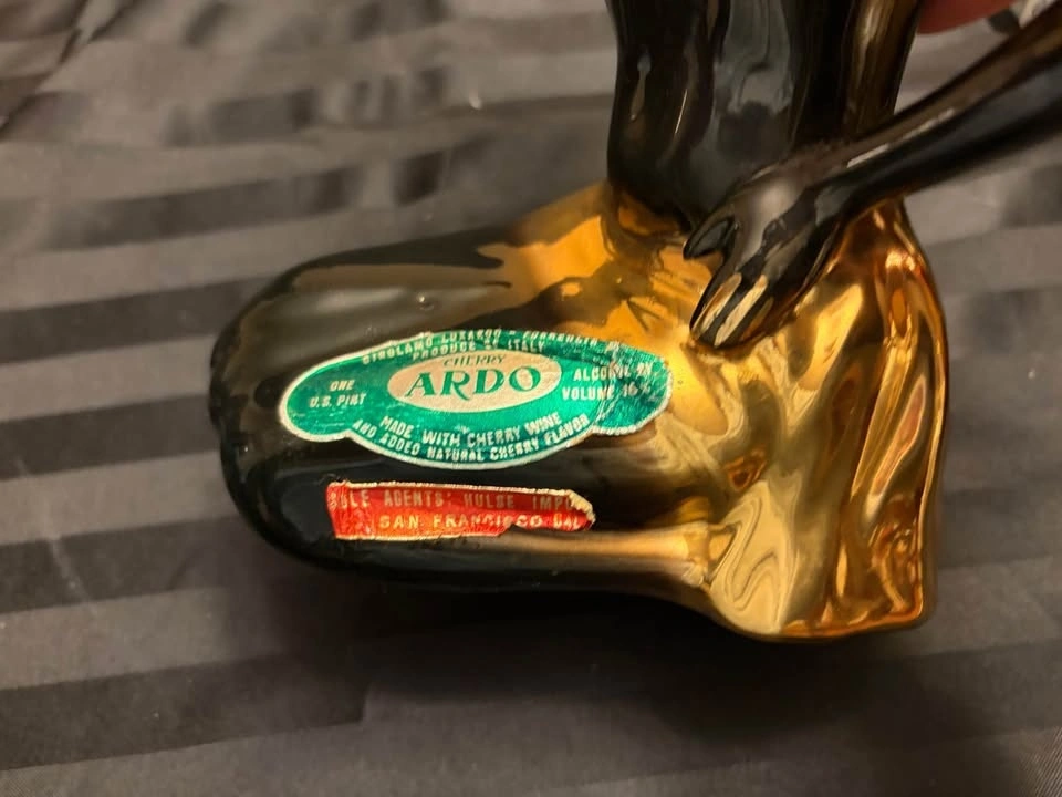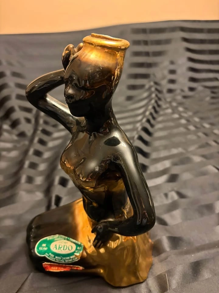 1960s sealed Luxardo Cherry Ardo liquor bottle in the shape of a kneeling woman. The bottle was designed to hold a limited amount of Cherry Ardo Italian Natural Cherry Wine Liqueur and was produced in various figural shapes, including this "African Lady" style. The bottle is made of ceramic. There has been much evaporation over the years as the bottle no longer feels full.
