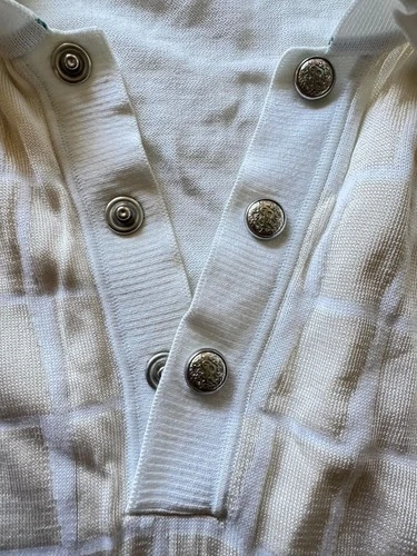 Crafted for the modern gentleman, this Stefano Ricci Polo embodies a timeless aesthetic with its classic geometric pattern and collared neckline. The shirt features a comfortable regular fit in size XL, corresponding to a 44 US and 54 IT, ensuring a generous and flattering silhouette for a variety of body types. The polo is a sophisticated blend of cotton and silk, with a light fabric wash that promotes breathability during wear. Short sleeves make it an ideal choice for warmer days or layering under a blazer. The pure white hue serves as a versatile base for any wardrobe. Measurements: