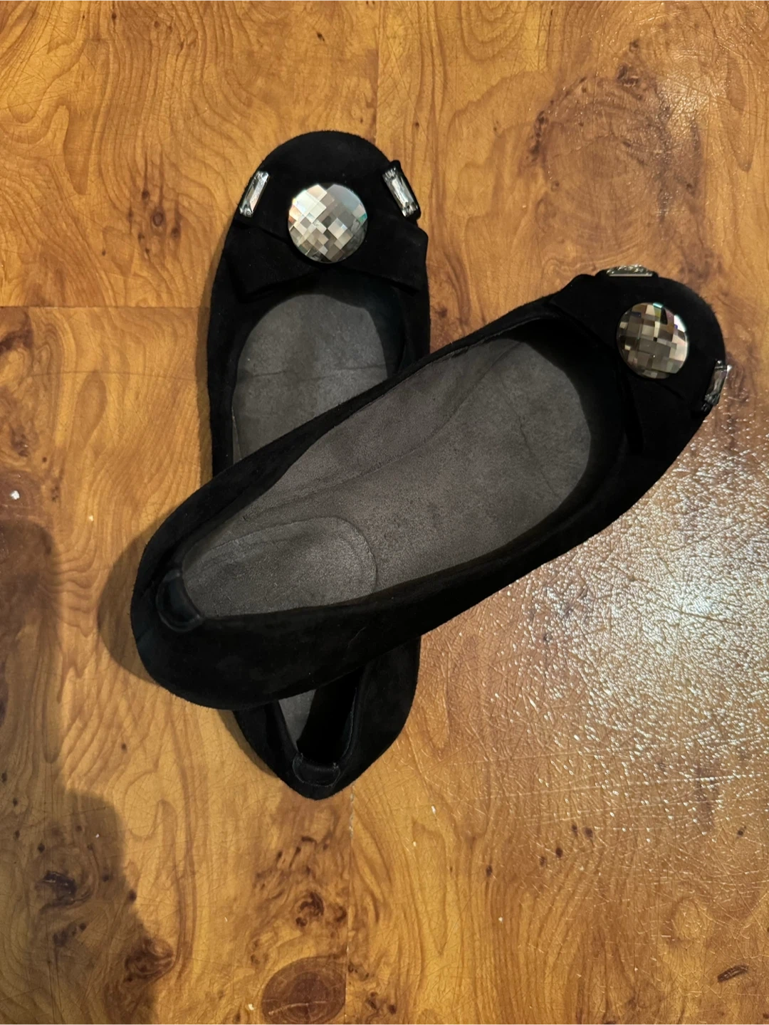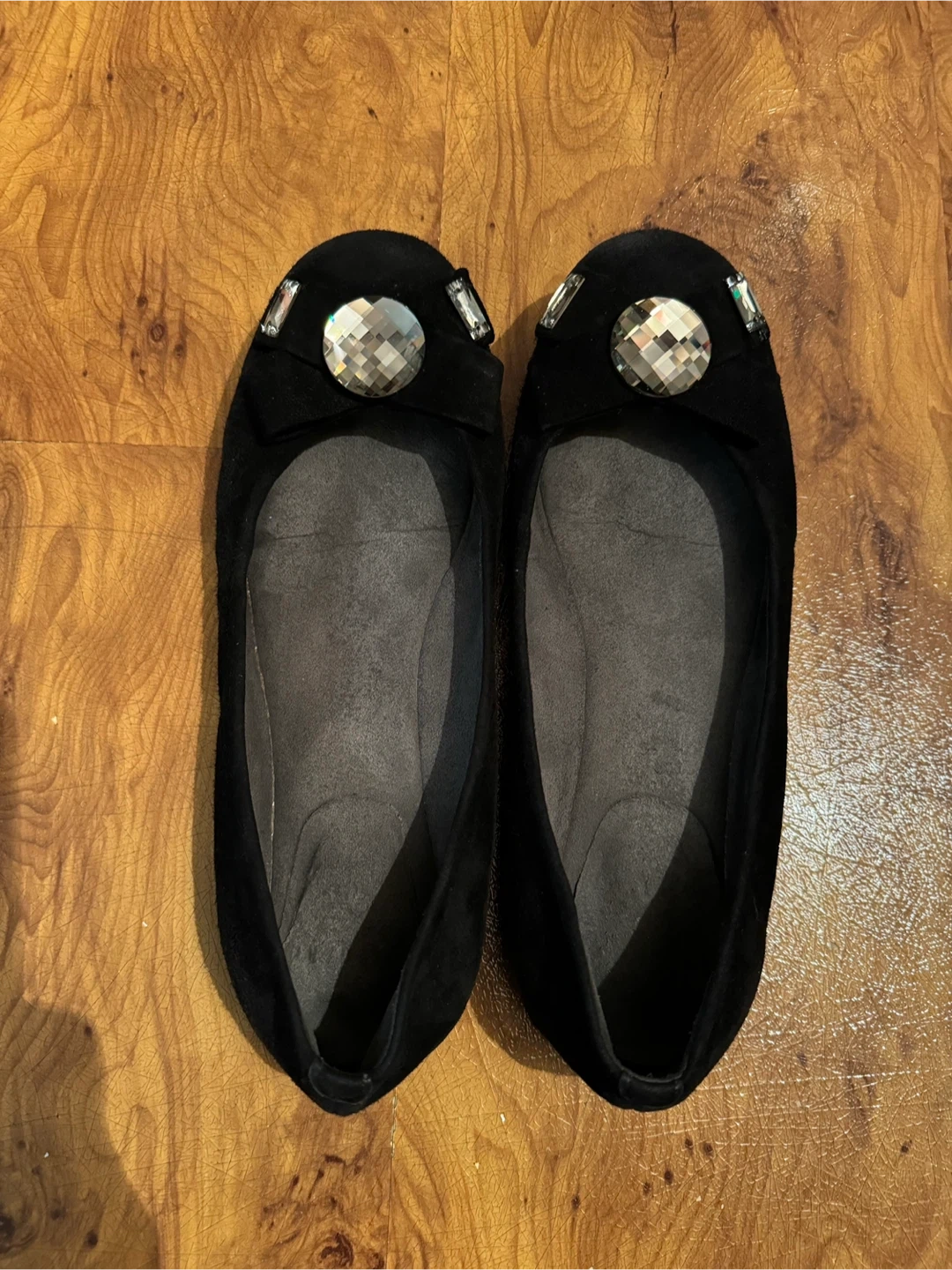 Chic black suede ballet flats from Stuart Weitzman. They feature a decorative bow accent with sparkling embellishments on the toe. Comfortable for everyday wear or dressed up for an evening out! Size 7.5-8
