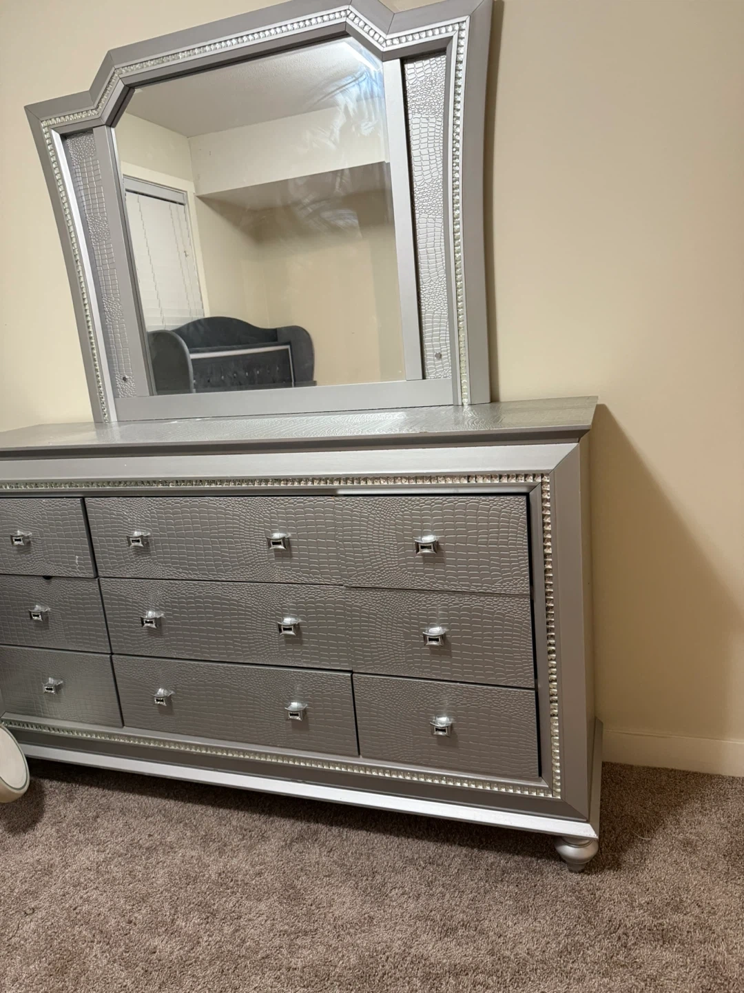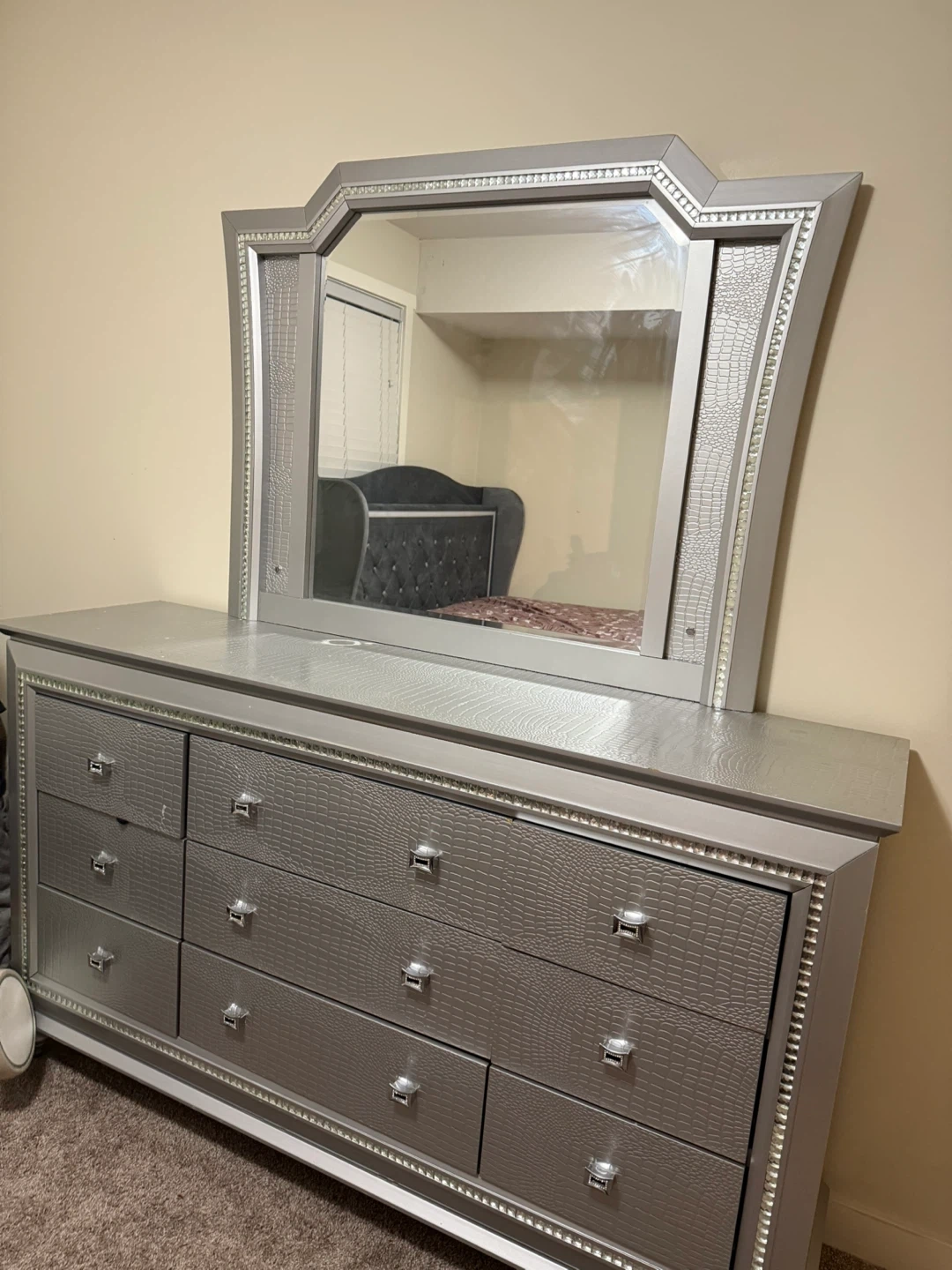 Silver dresser with mirror and nine drawers. It's made with a textured faux crocodile finish and rhinestone trim. Includes stylish chrome handles.