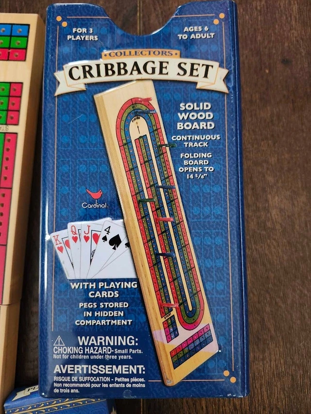 Get ready for a classic game night with this Cardinal Collector's Cribbage Set. It includes a solid wood board with a continuous track, playing cards, and pegs stored in a hidden compartment. This set is in used condition but ready for countless hours of entertainment. Key features: Solid wood board, Continuous track design, Folding board opens to 14 5/8 inches, Includes playing cards, Pegs stored in a hidden compartment. Cash accepted.