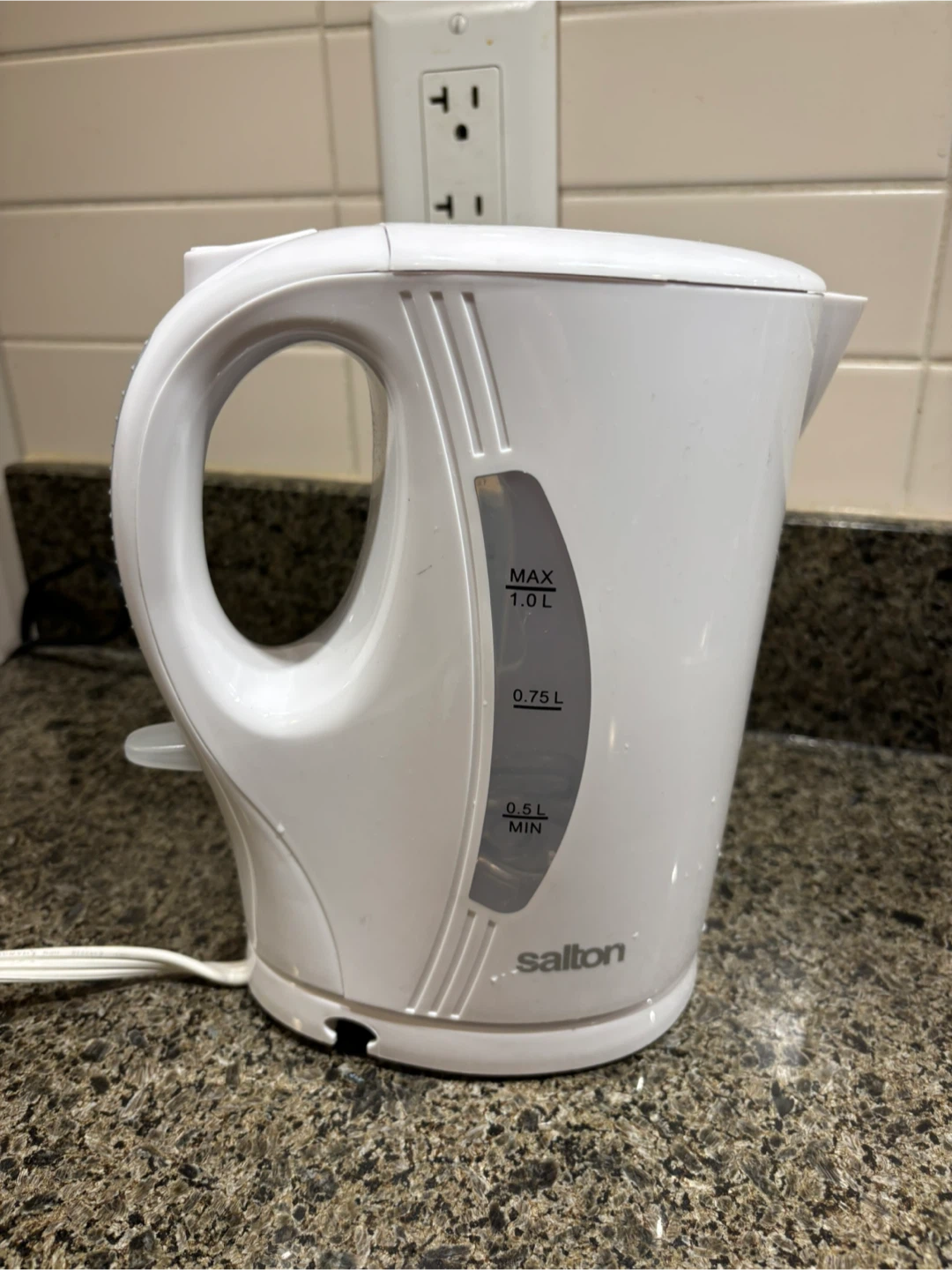 Selling a Salton electric kettle in great condition! It's white and has a capacity of up to 1.0 L. Perfect for quickly boiling water for tea or coffee