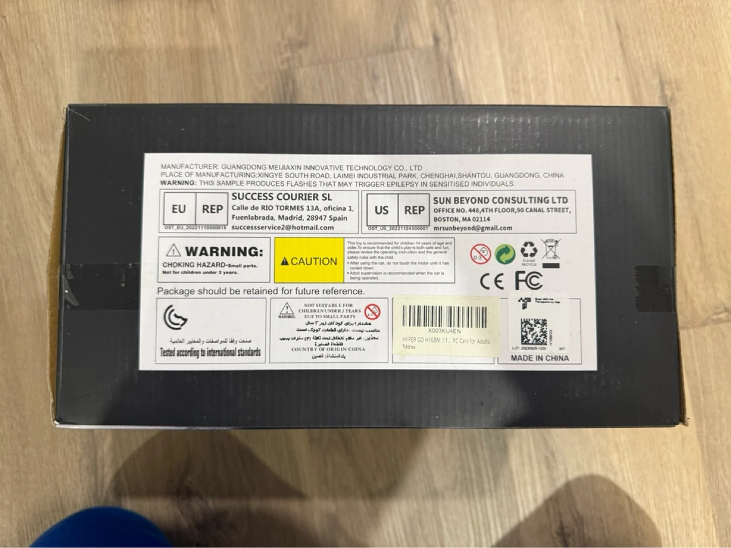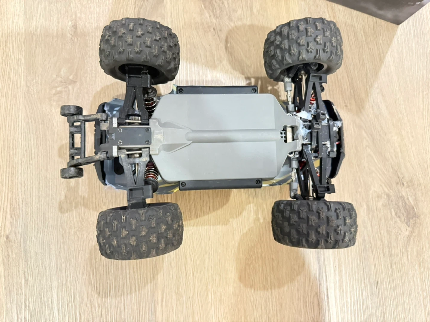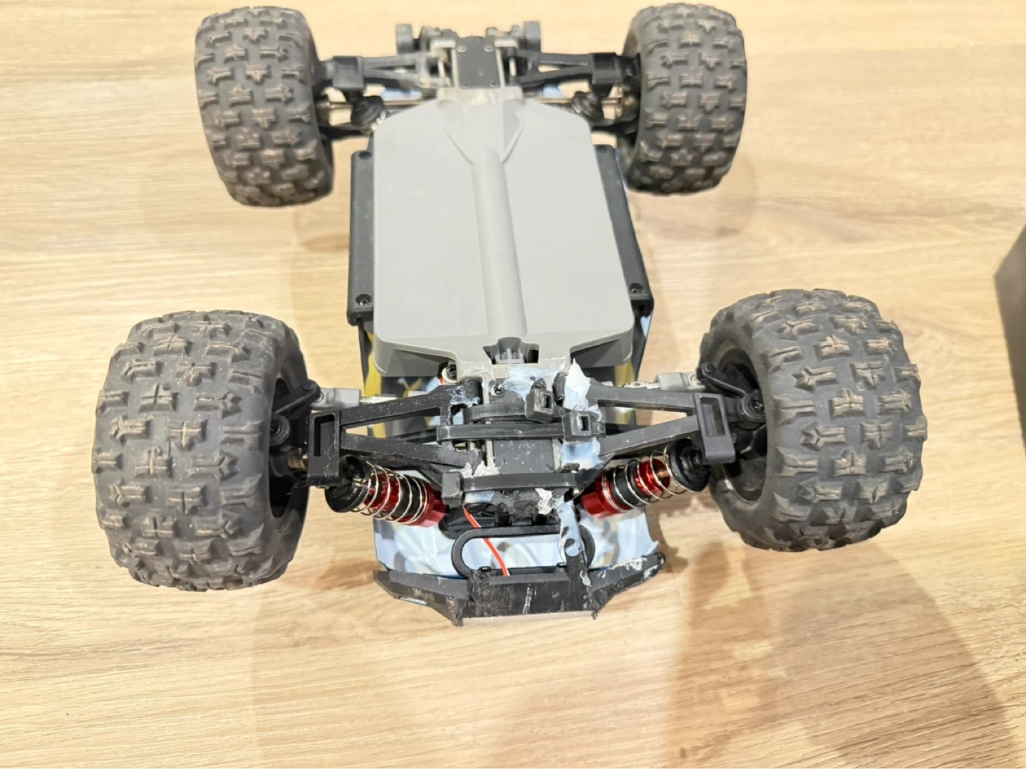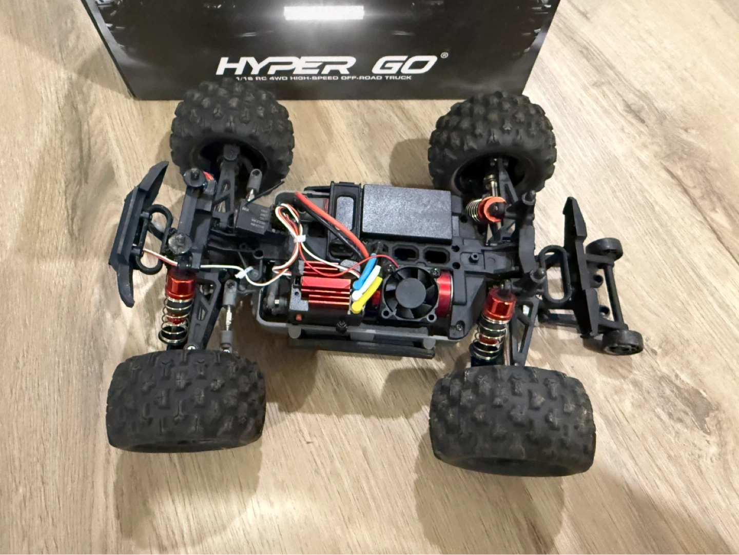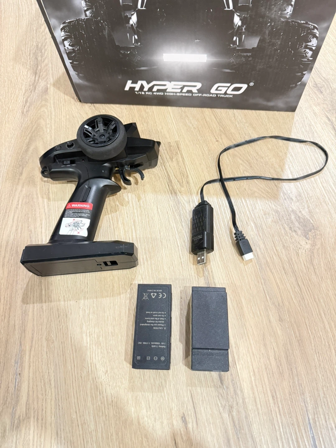 This is a 1/16 scale RC 4WD high-speed off-road truck. It's designed for remote control fun. Comes in the original box with the vehicle. It has a few damaged spots, like the plastic frame, the bottom but was fixed and still works properly and normally, comes with 2 chargeable batteries and a nice remote. All will me in the box as well