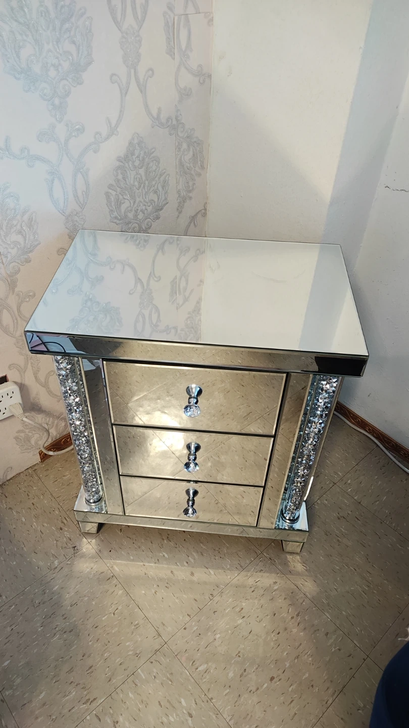 Mirrored three-drawer nightstand with crystal-look drawer pulls and decorative crystal accents on the sides. Its mirrored finish and crystal details give it a glam look. This nightstand's reflective surfaces make a room feel larger and brighter. Offers ample storage for bedside essentials.(Has some small scratches almost not noticable on top)