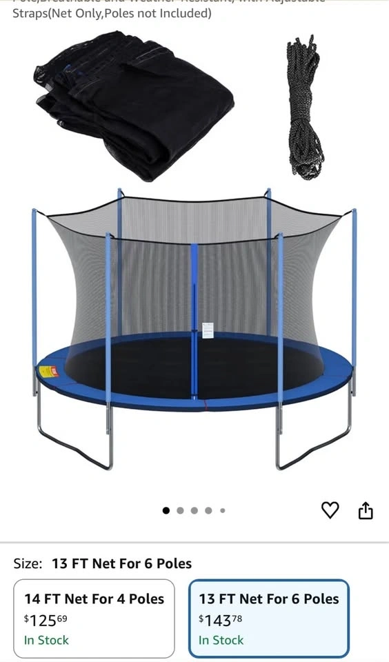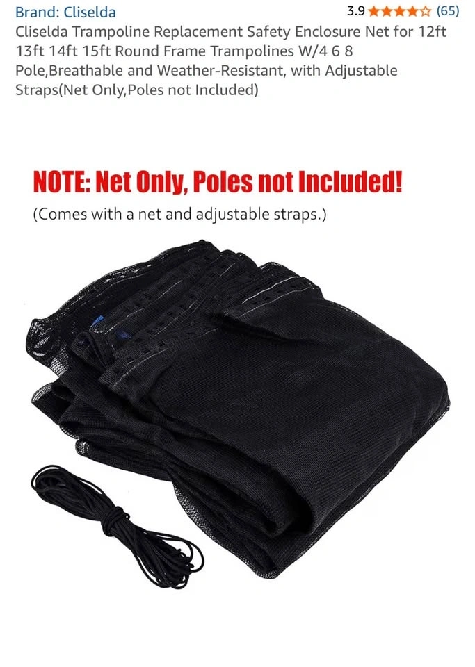 Brand new Cliselda trampoline safety net. This is a 14ft replacement net for round trampolines with 4 poles. Net only, poles not included. Made from UV resistant PE material. Features a zipper and quick-lock buckles for safety. Easy to install, no tools needed. Comes with rope and clips. Please check your trampoline size and pole count before buying!