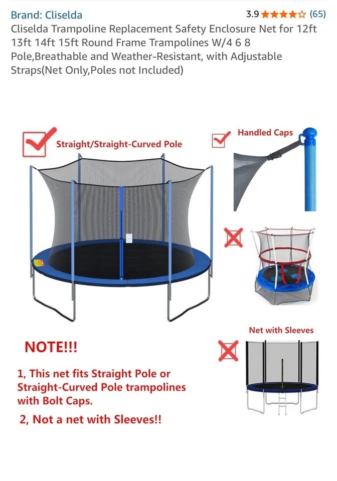 Brand new Cliselda trampoline safety net. This is a 14ft replacement net for round trampolines with 4 poles. Net only, poles not included. Made from UV resistant PE material. Features a zipper and quick-lock buckles for safety. Easy to install, no tools needed. Comes with rope and clips. Please check your trampoline size and pole count before buying!