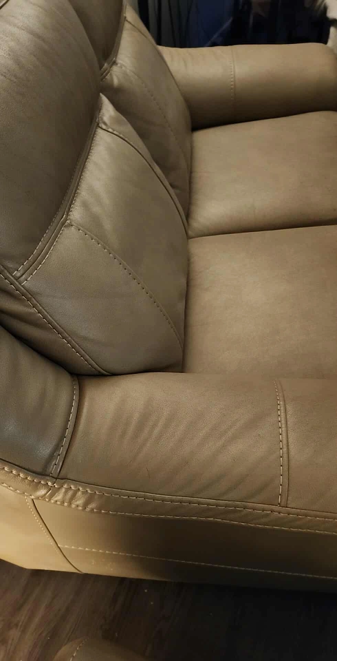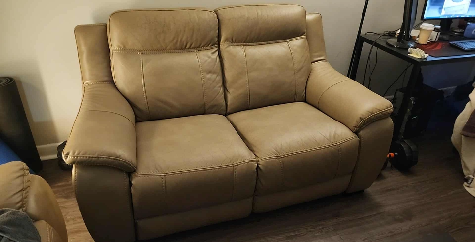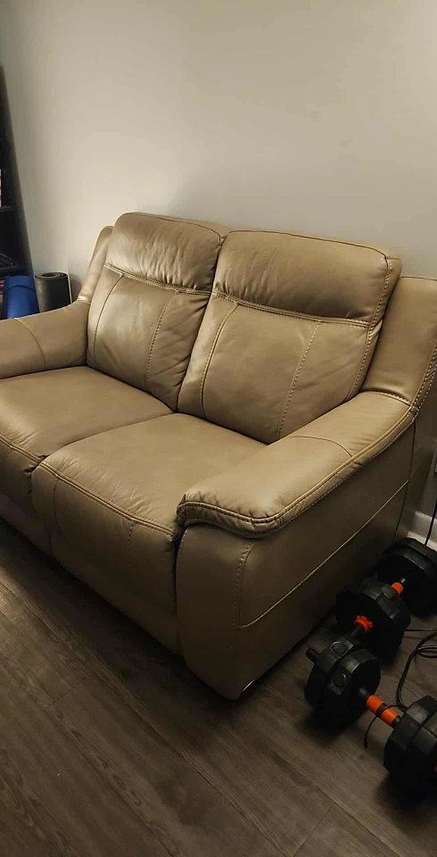 Selling a comfy leather loveseat in a neutral beige/tan colour. It's in good condition and would be a great addition to any living room or den. Perfect for relaxing after a long day!