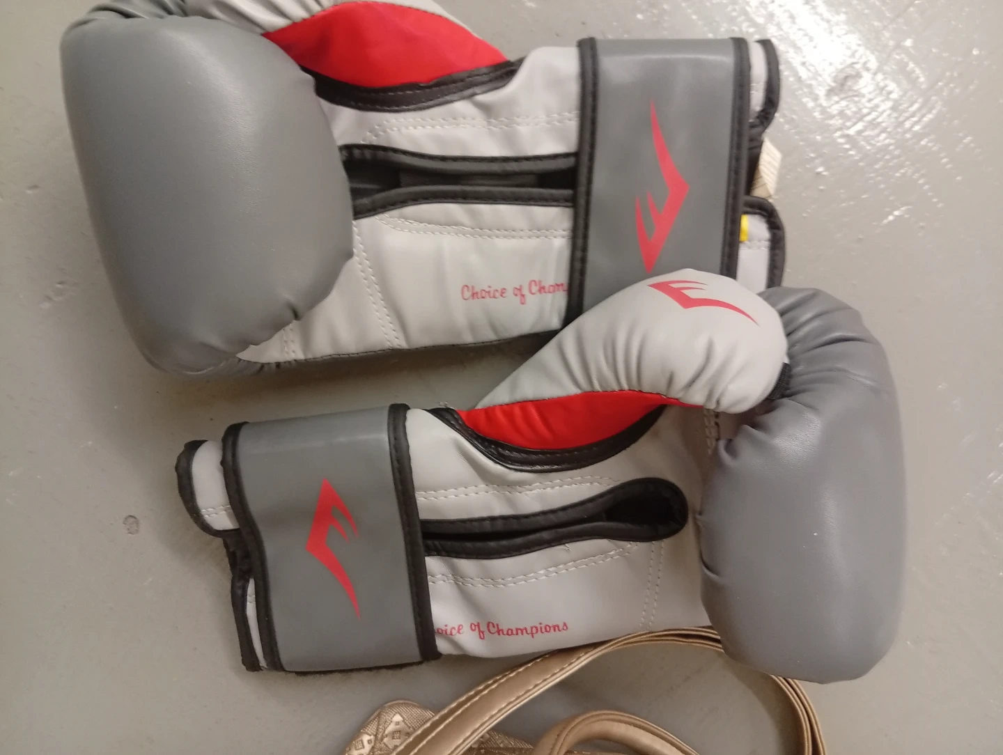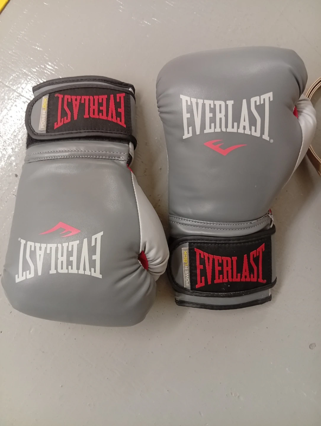 Everlast PowerLock boxing gloves in grey. Designed with "Choice of Champions" on the cuff. These gloves offer good padding for training.