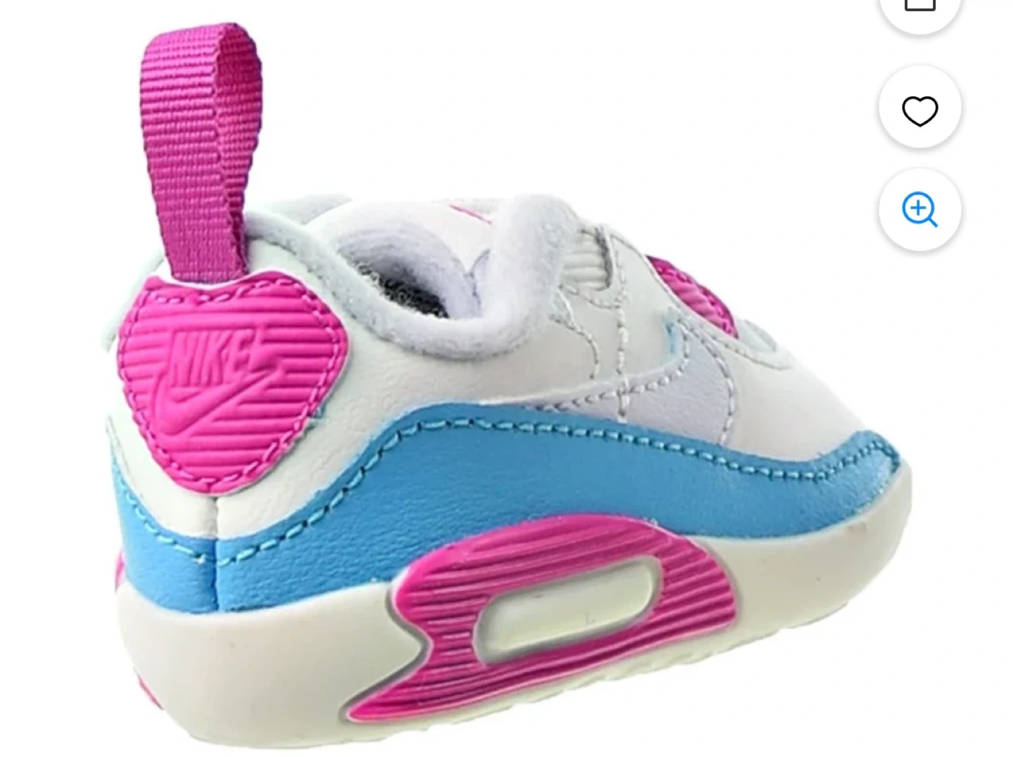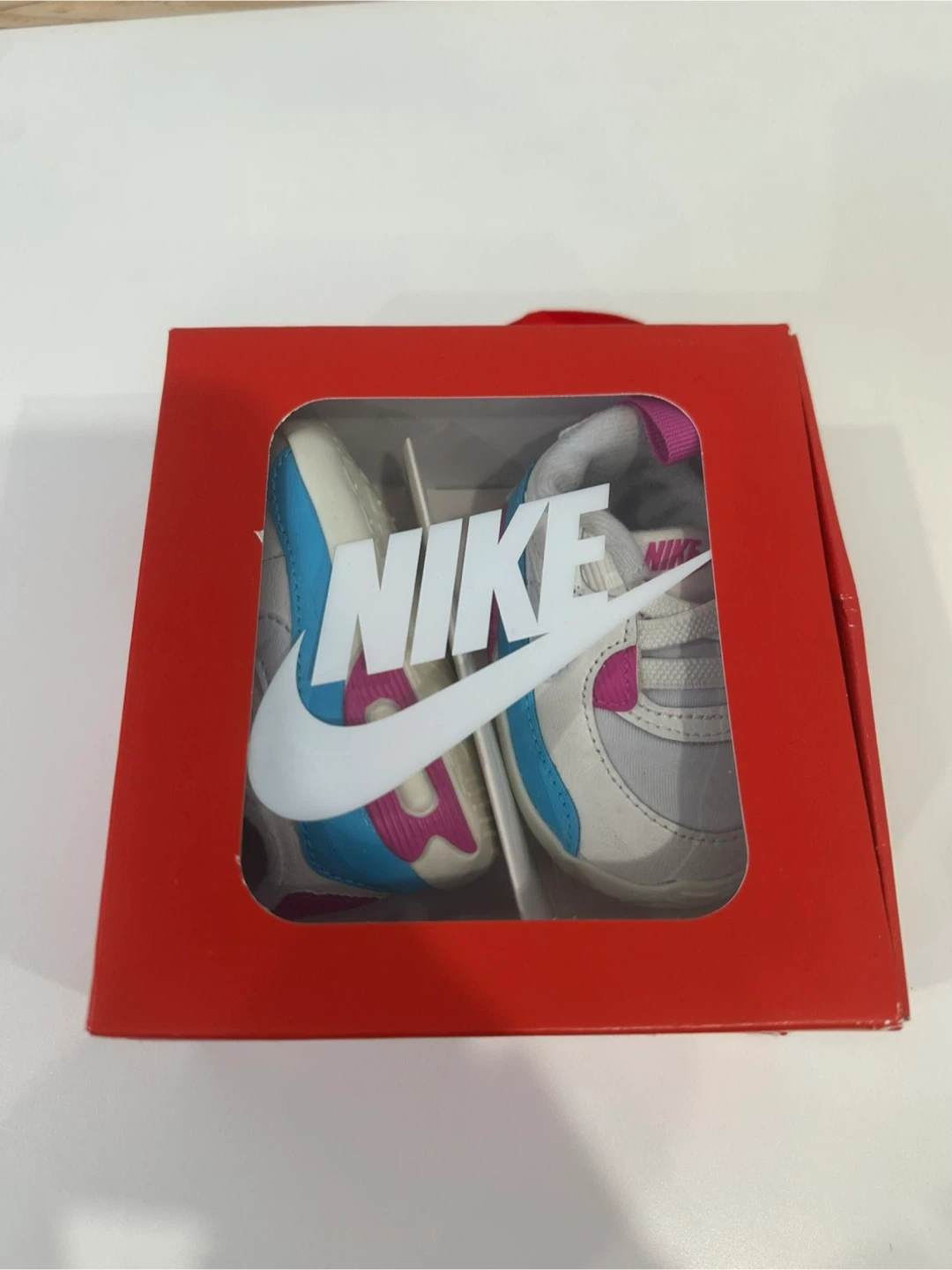 These adorable Nike Max 90 Crib (CB) baby shoes are brand new and ready for a new home! They come in a size 2c and feature a cute design with white, blue, and pink accents. The shoes come with the original box.