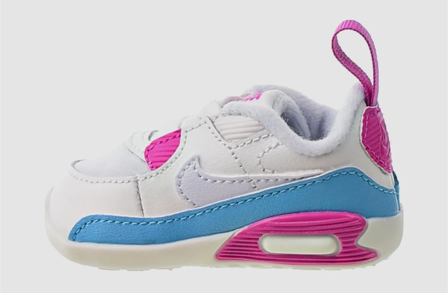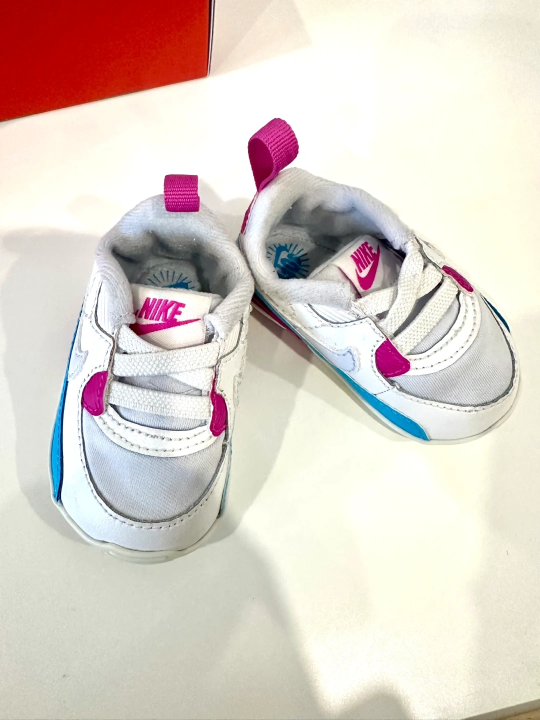 These adorable Nike Max 90 Crib (CB) baby shoes are brand new and ready for a new home! They come in a size 2c and feature a cute design with white, blue, and pink accents. The shoes come with the original box.