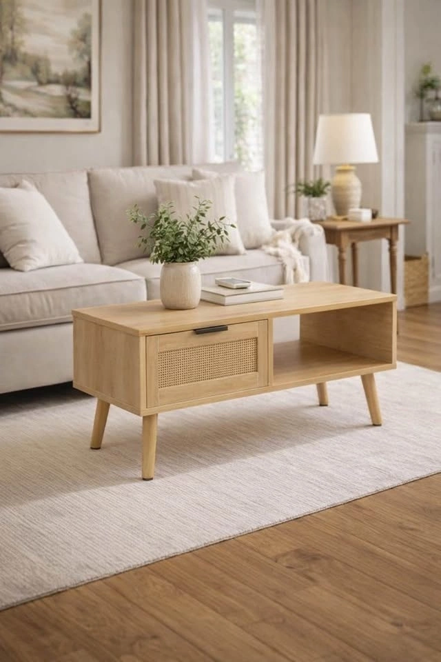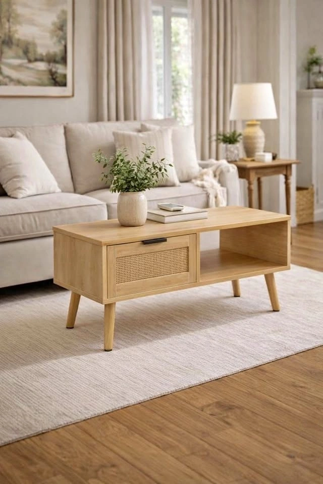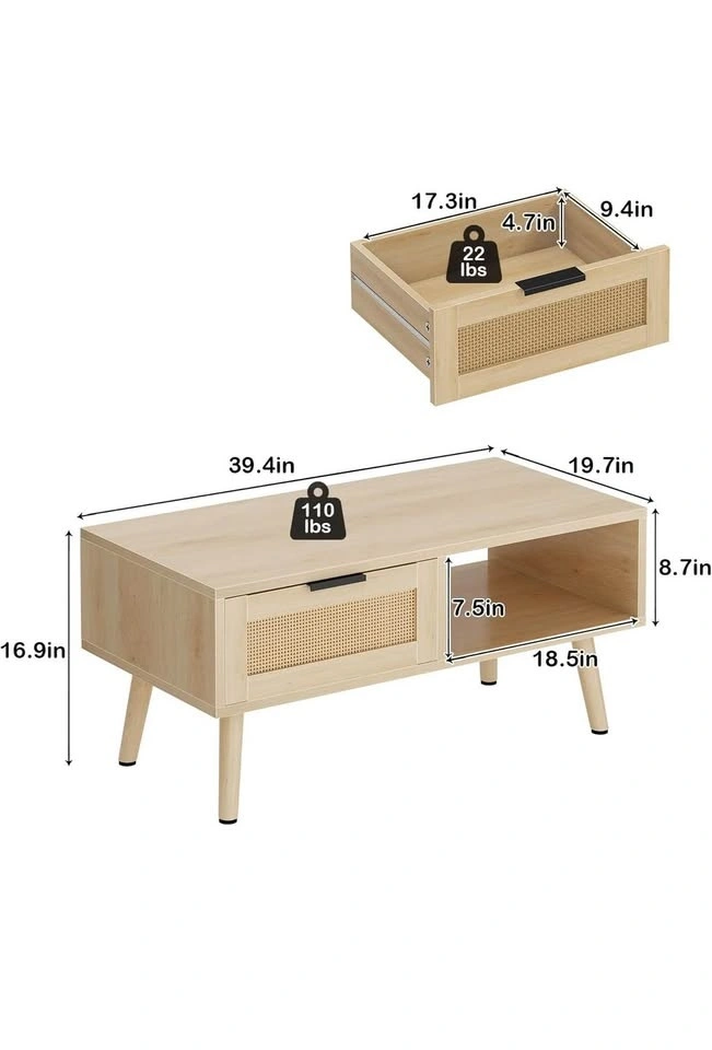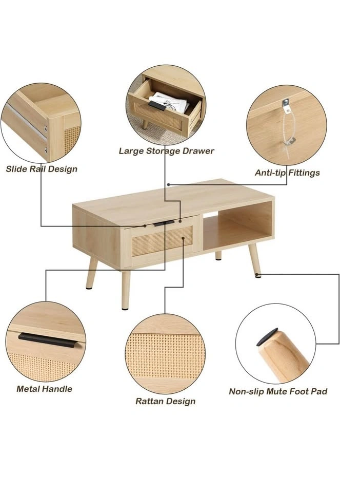 Mid century modern style coffee table featuring a smooth glide rattan front drawer, and an open storage space. Brand new in box.
