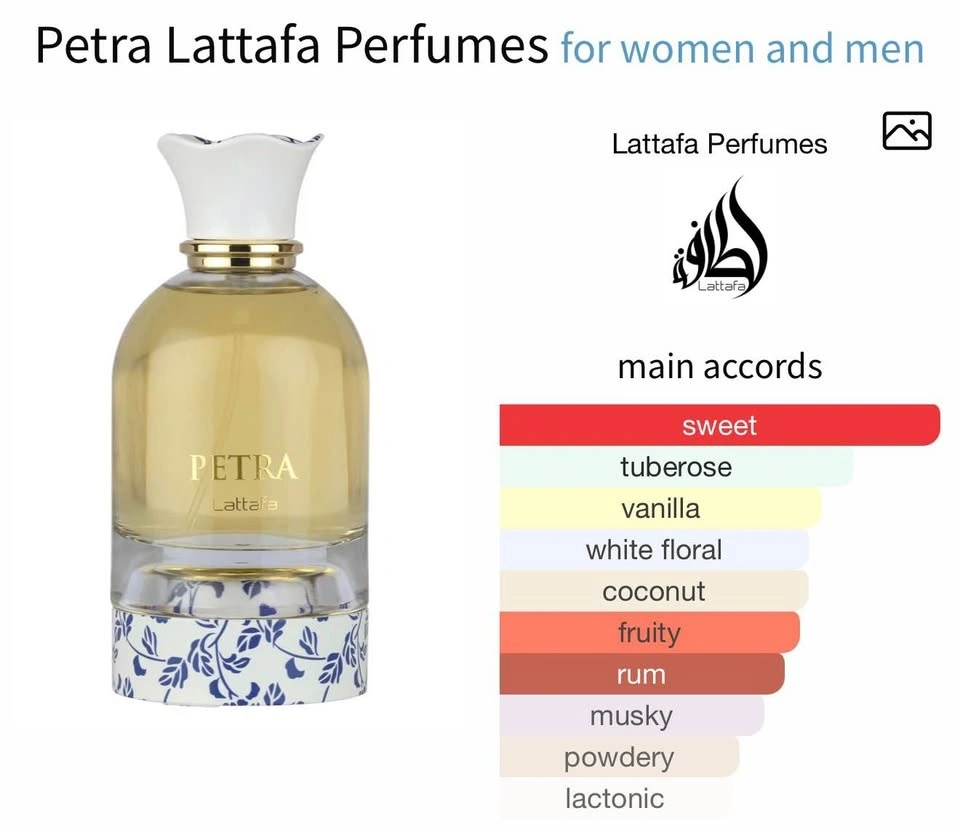 Petra by Lattafa Perfumes is a Floral Fruity Gourmand fragrance for women and men. This is a new fragrance. Top notes are Rum and Plum; middle notes are Tuberose and Coconut; base notes are Vanilla, Musk and Praline. Perfume comes with box!