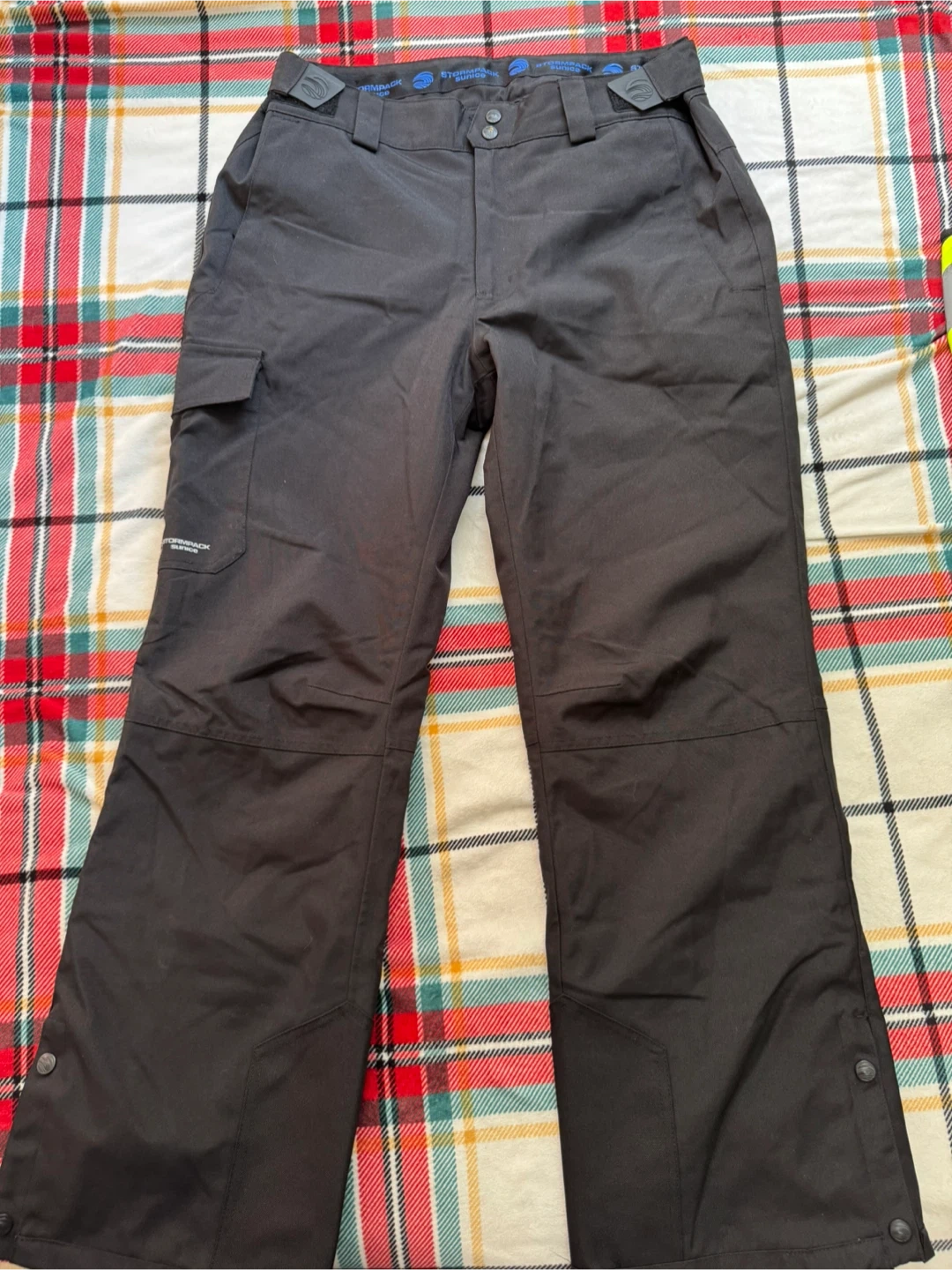 Black Stormtech pants—great for hitting the slopes, waterproof and windproof with cargo pockets. Includes adjustable waist tabs for a snug fit.