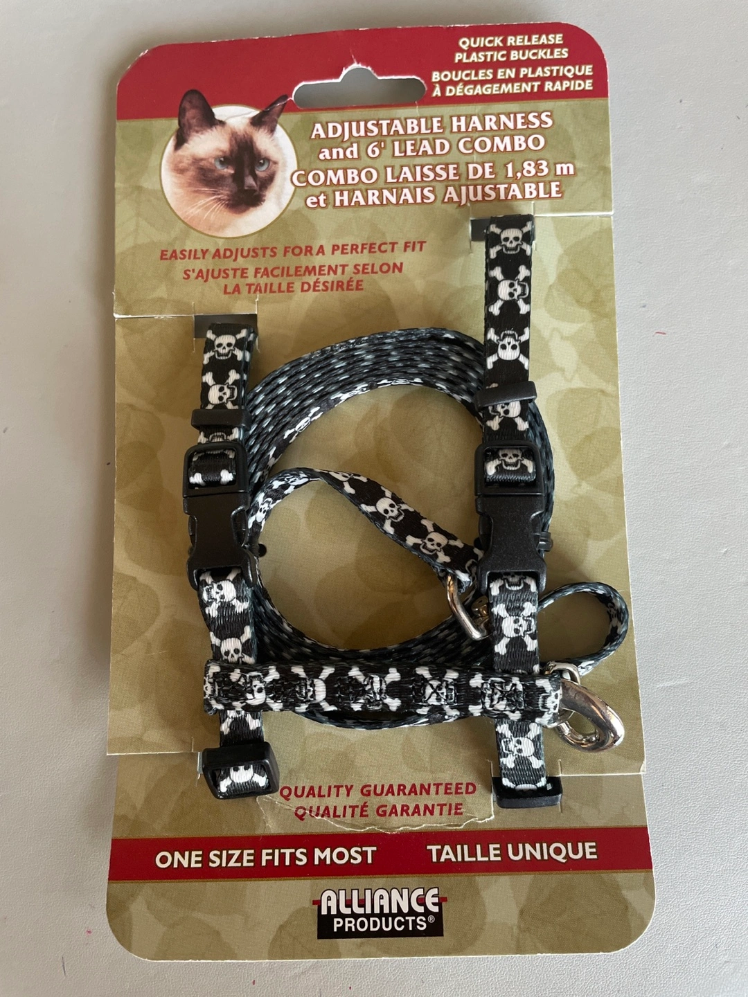 Selling a brand new adjustable cat harness and 6' lead combo. It's one size fits most and has quick release plastic buckles. The harness is black and white with a skull pattern. Quality guaranteed!