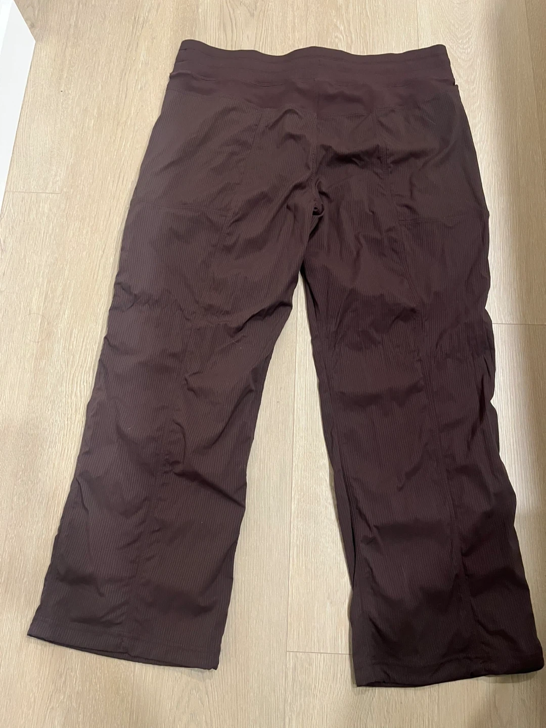 Brown Lululemon athletic pants with a subtle pinstripe pattern. These pants feature a drawstring waist and are made for comfort during workouts. They're a capri length and have two side pockets. Size 14