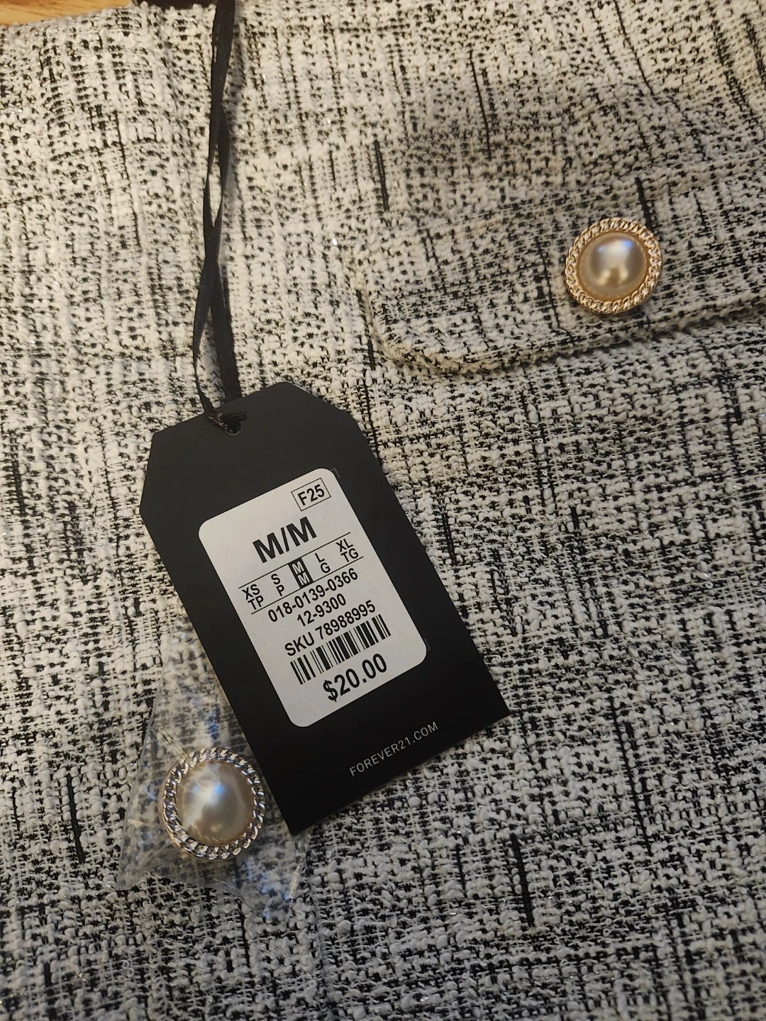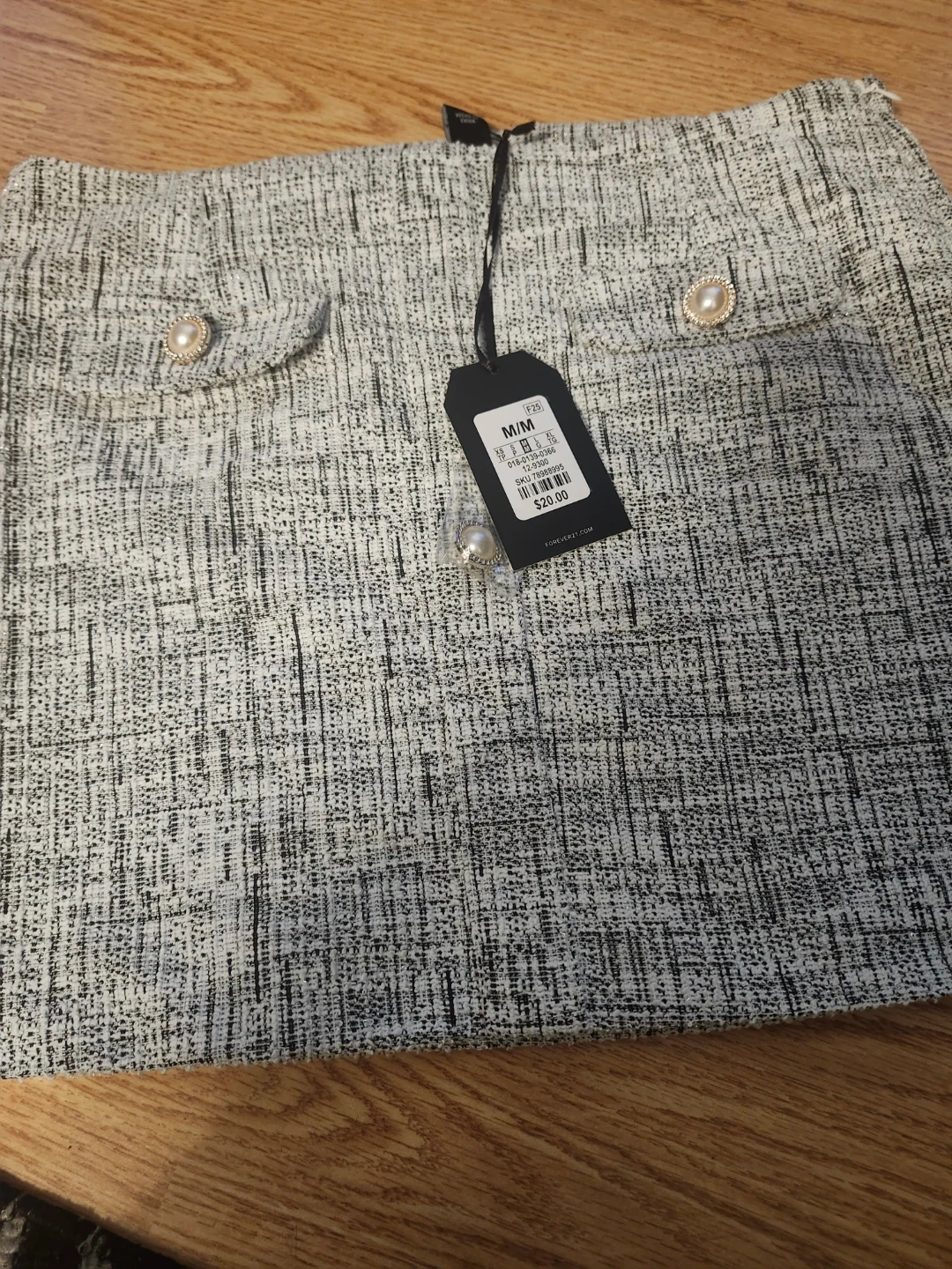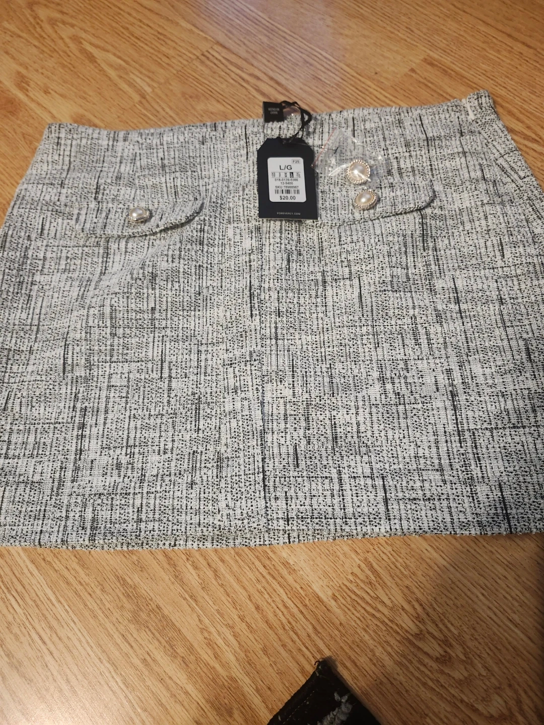 This is a Forever 21 tweed mini skirt. It's black and white with decorative pearl and gold button details. Includes two extra button in a sealed bag.