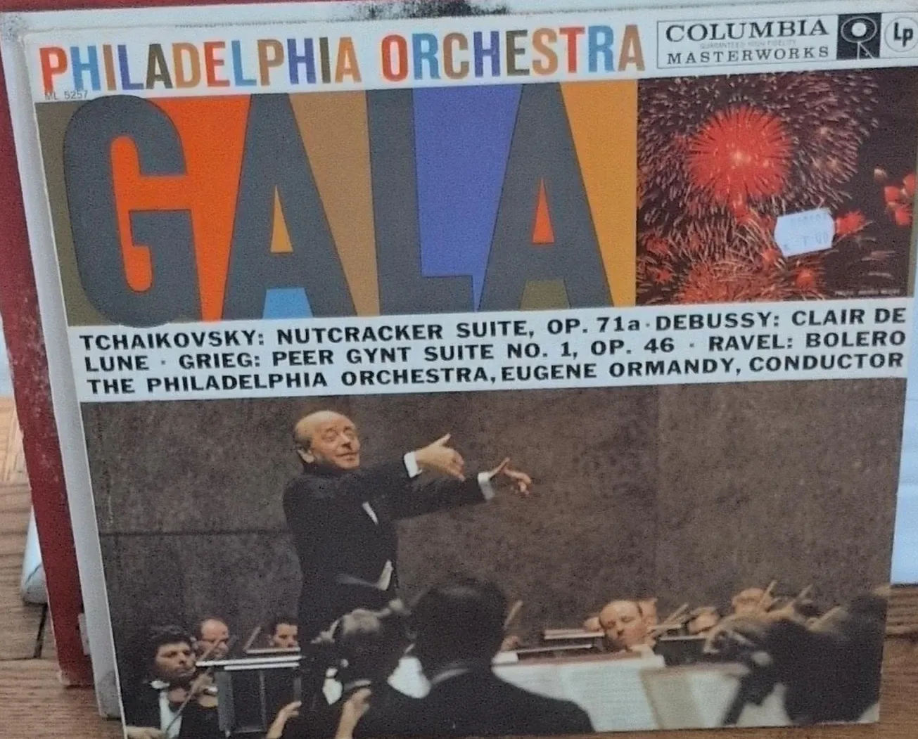 This Columbia Masterworks LP features "Gala" performances by The Philadelphia Orchestra, conducted by Eugene Ormandy. It includes Tchaikovsky's Nutcracker Suite, Debussy's Clair de Lune, Grieg's Peer Gynt Suite No. 1, and Ravel's Bolero. This record is a wonderful addition for classical music enthusiasts.