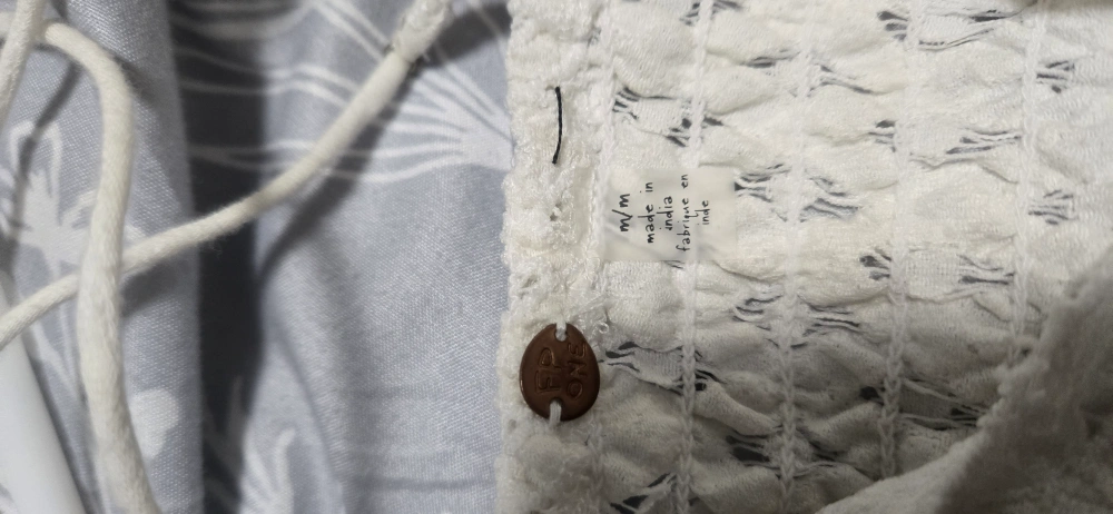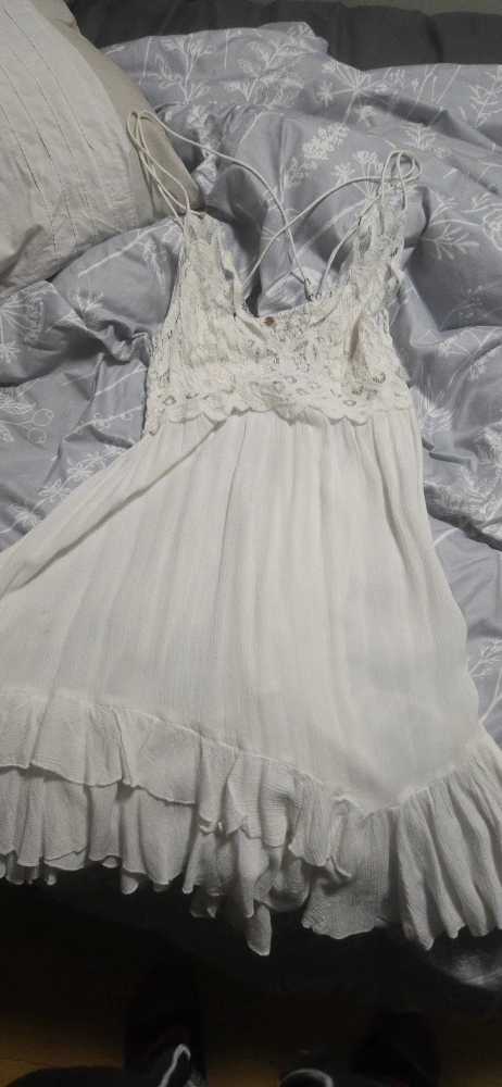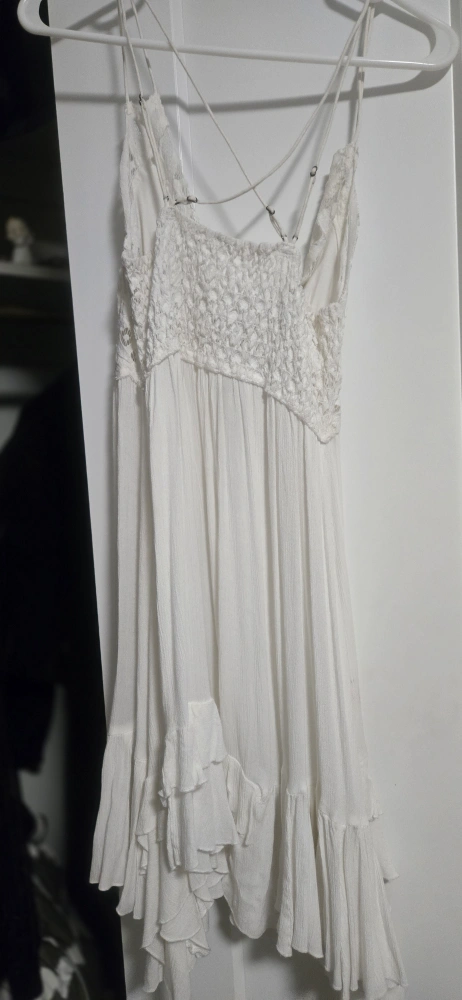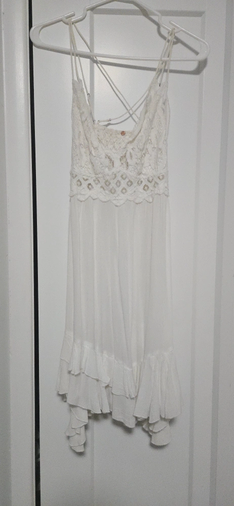 Beautiful Free People mini dress. White lace bodice, ruffled hem. Size medium. Cross back straps. Excellent condition.