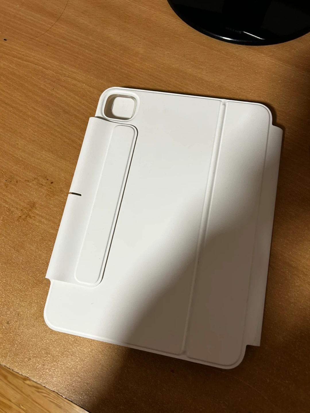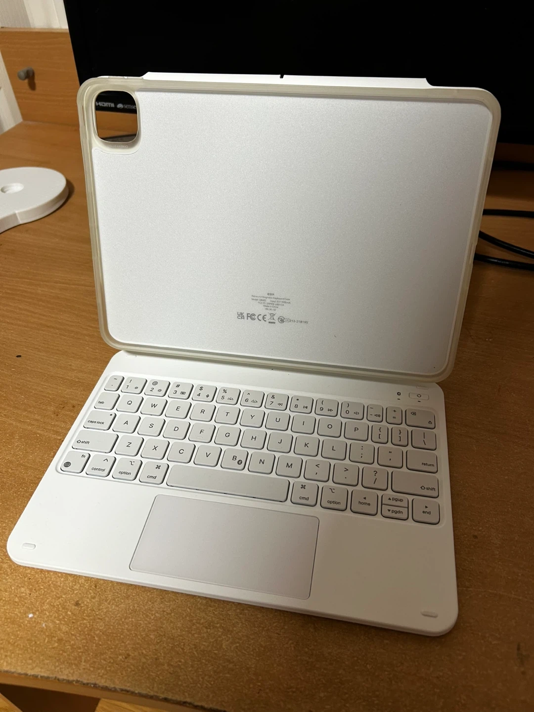 White Keyboard for iPad Pro. It's a full-size keyboard with a trackpad and USB-C passthrough charging. It also has a protective case for your iPad. Works with iPad Pro 12.9”
