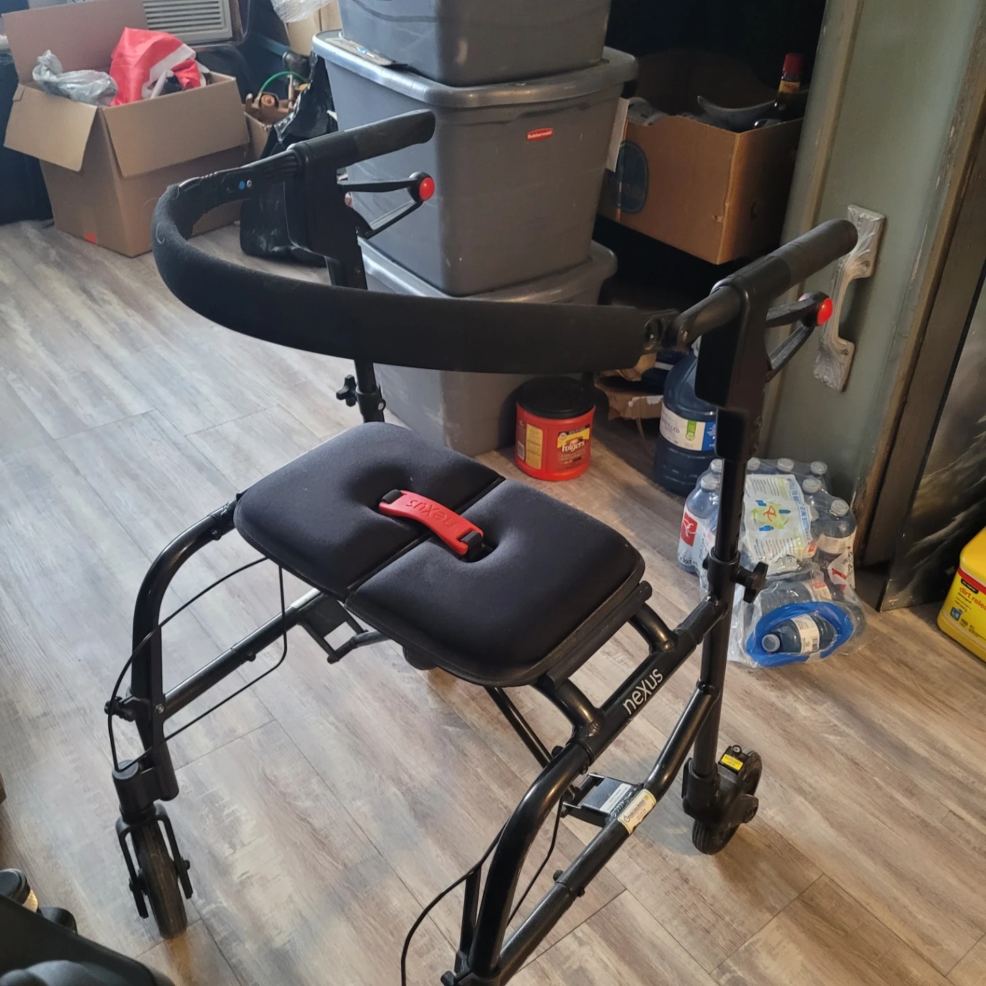 This is a Nexus rollator walker with a built-in seat. It's black and designed for mobility assistance. The seat has a red safety strap.