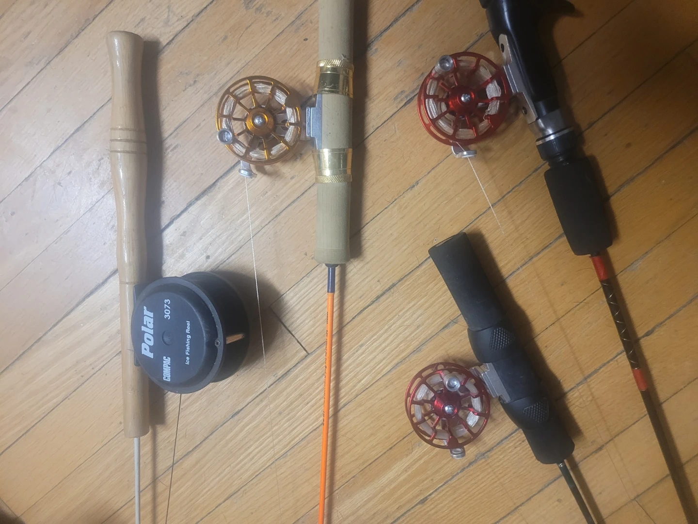 Includes four fishing rods and four reels. One reel is a Polar brand 3073 ice fishing reel. Various sizes and styles are included.