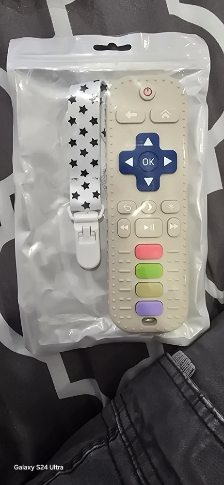 This is a baby TV remote toy, still new in its original packaging! It comes with a clip to attach to your little one's clothes or stroller. The remote has colourful buttons and is designed to entertain and engage babies.