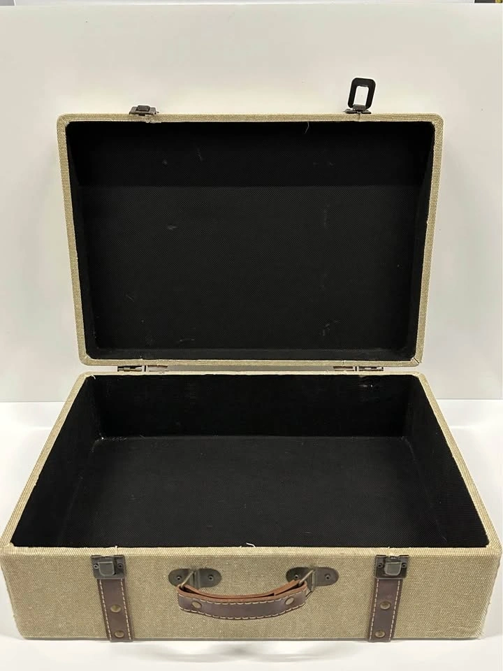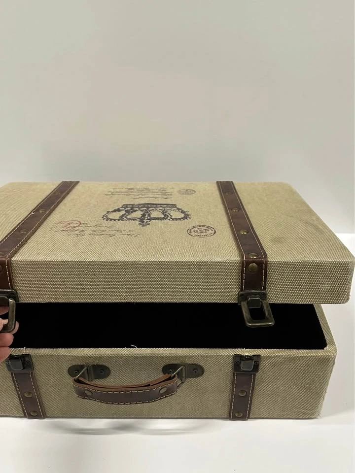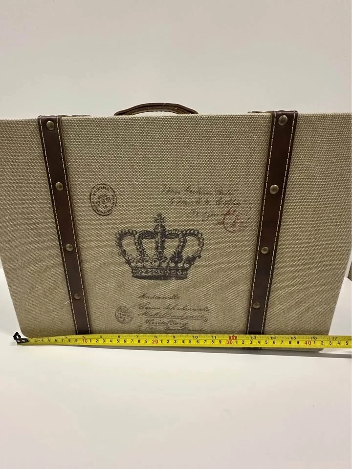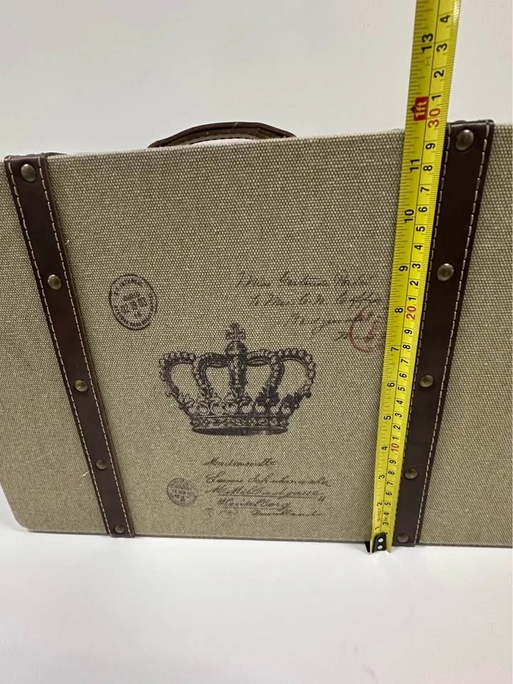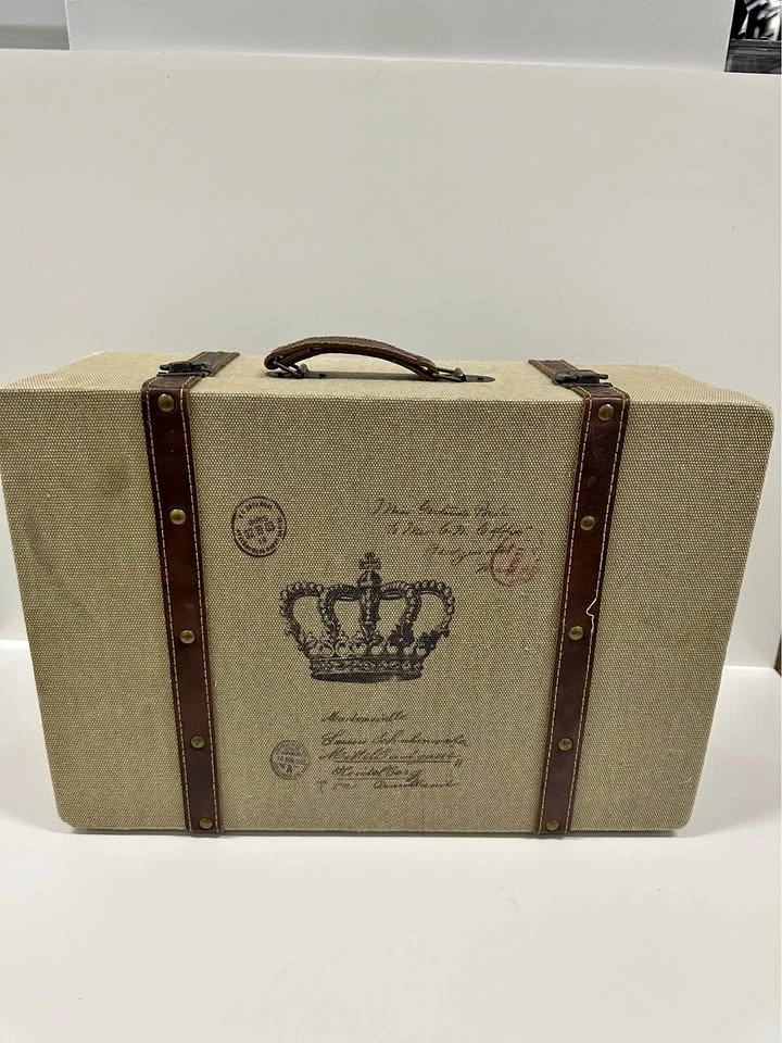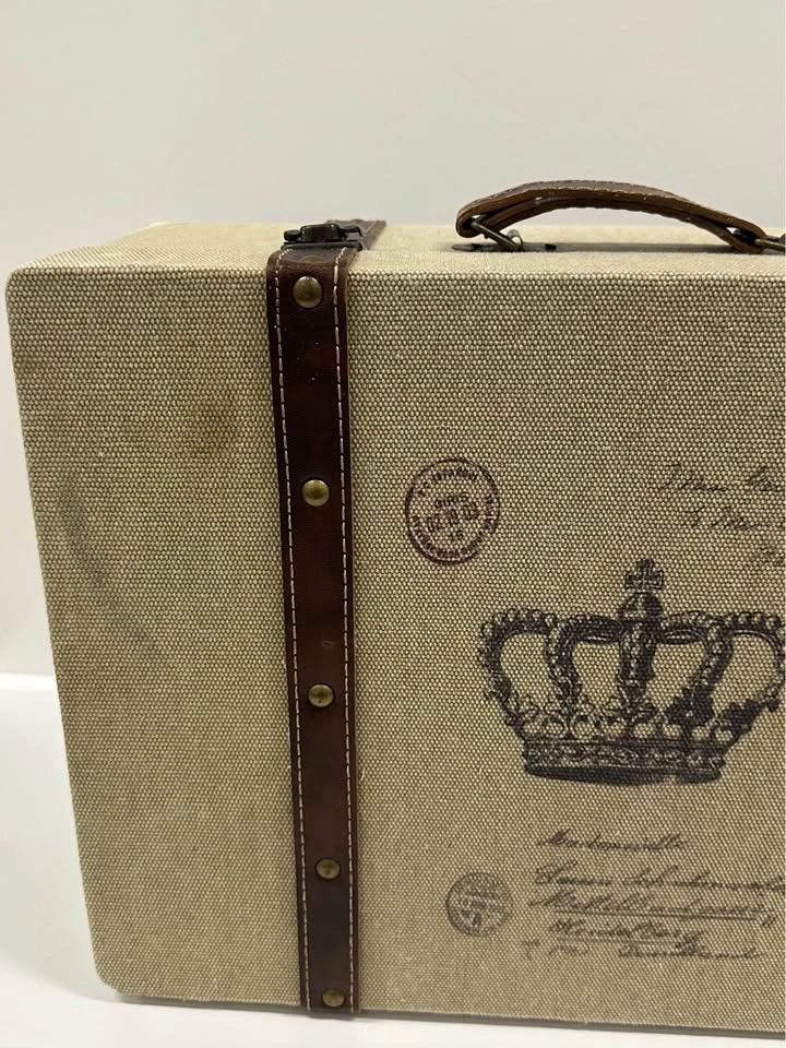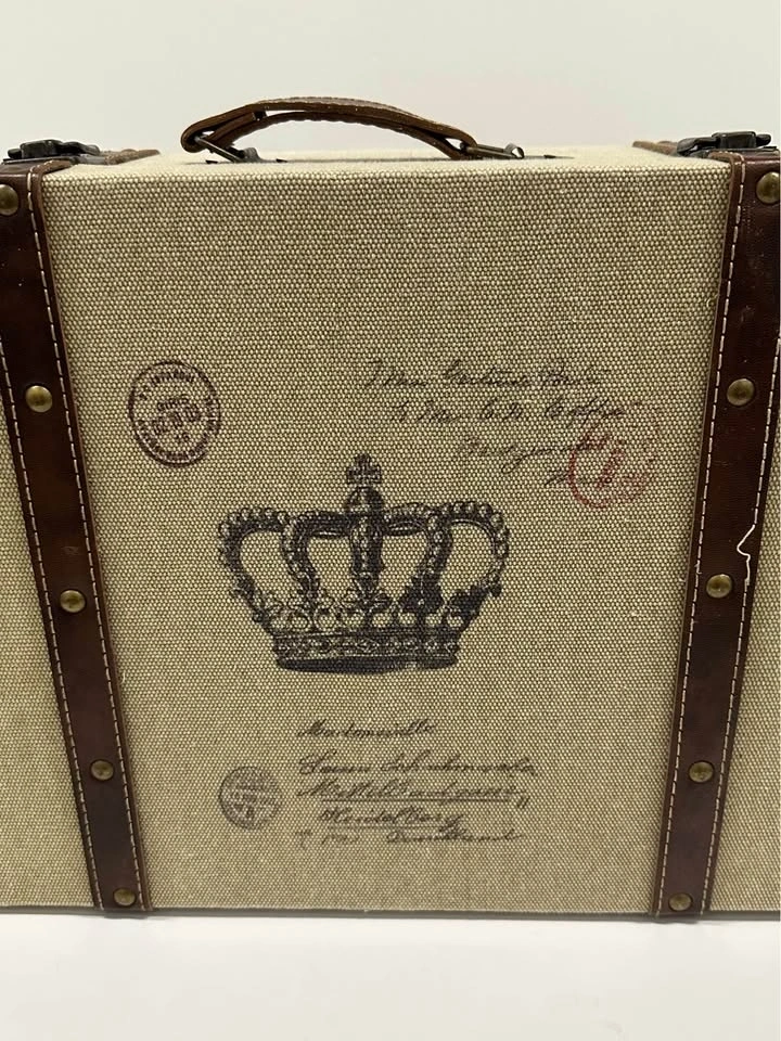 Decorative vintage-style storage suitcase with crown design. Great for home decor or storage. Sturdy box with handle and metal clasps. Fabric exterior with faux leather straps. Clean inside. Size approx: ~16” x 10” (see photos for measurements). Perfect for storing photos, documents, or as a decorative piece.