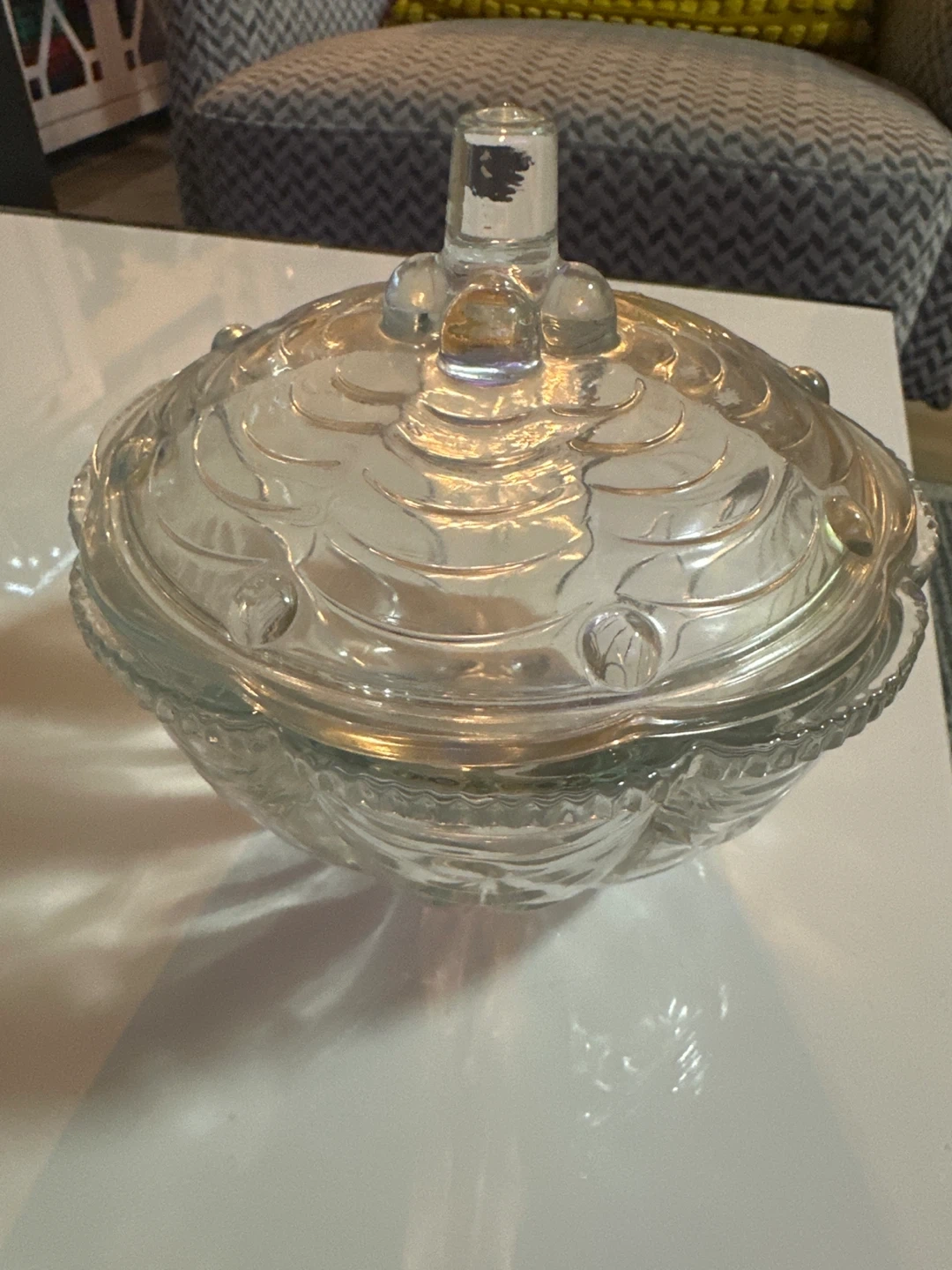 Selling a beautiful vintage clear glass candy dish with a lid. It has a lovely decorative pattern and would be perfect for displaying candies or other small treats. It's in great condition and ready to add a touch of elegance to your home!