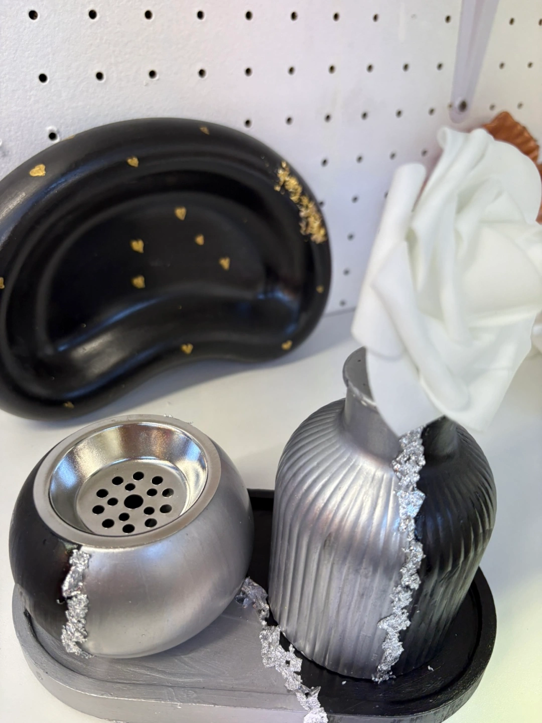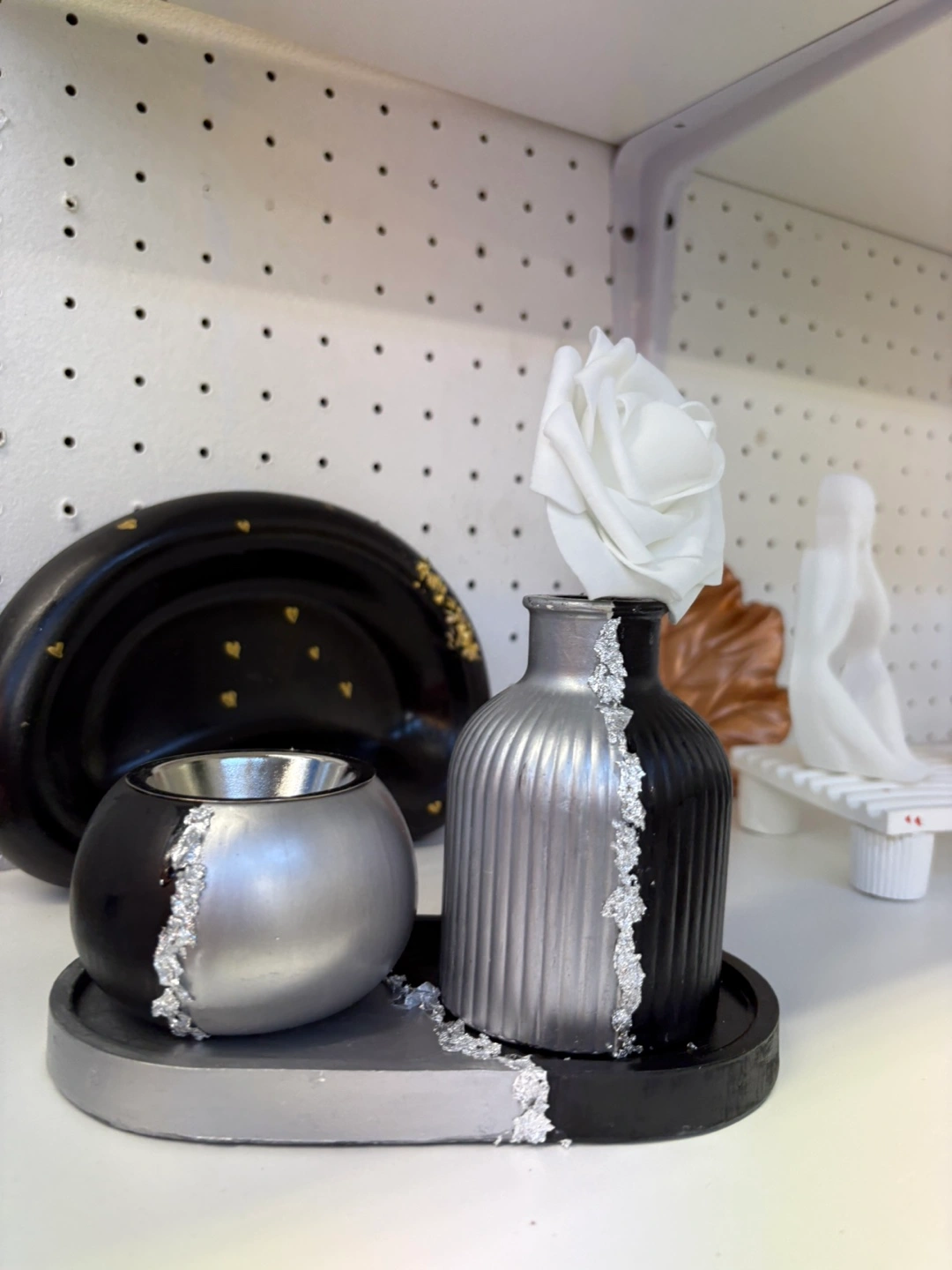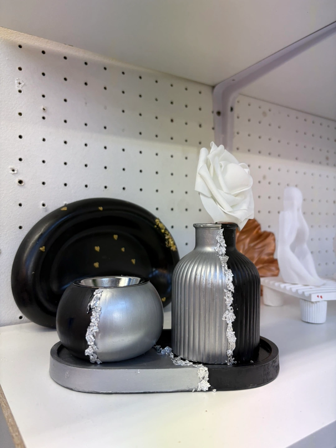 Elevate your home décor with this unique and versatile handmade Jesmonite set (tray, vase and intense burner or box) black and silver. This striking piece features a modern design with a contrasting black and silver finish, adding a touch of contemporary elegance to any space.