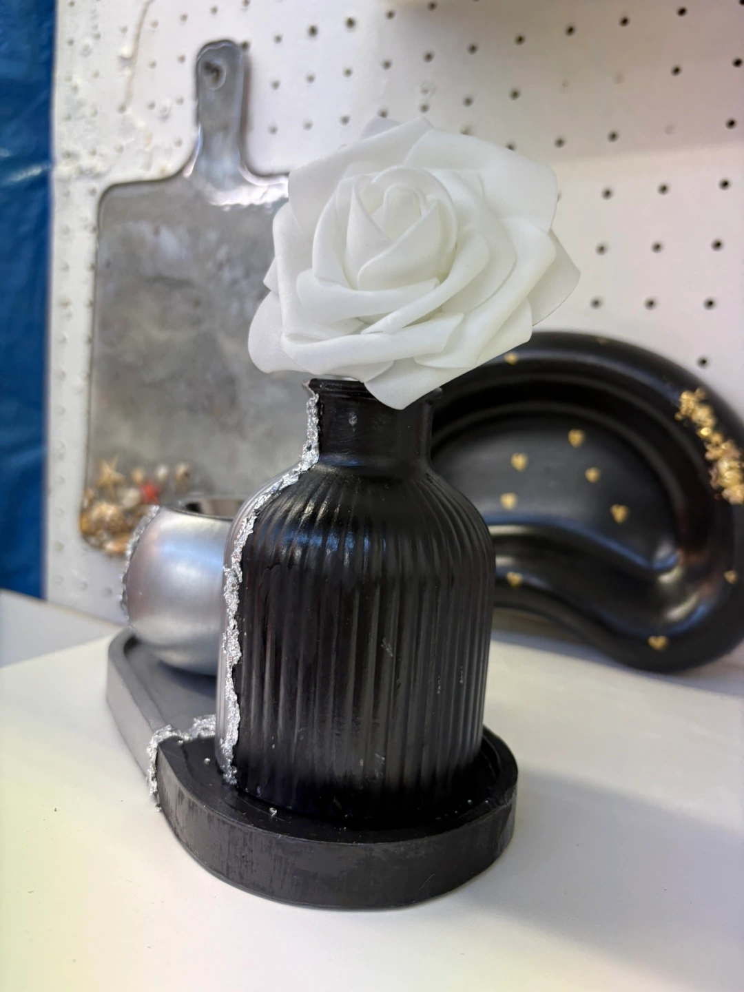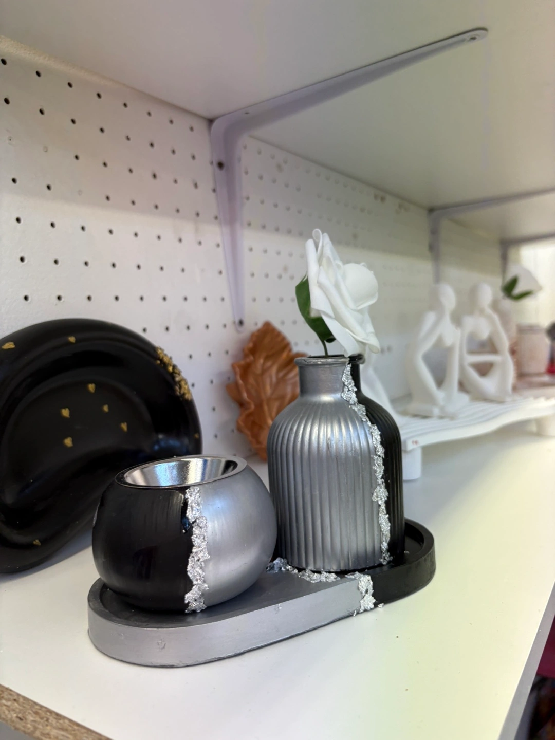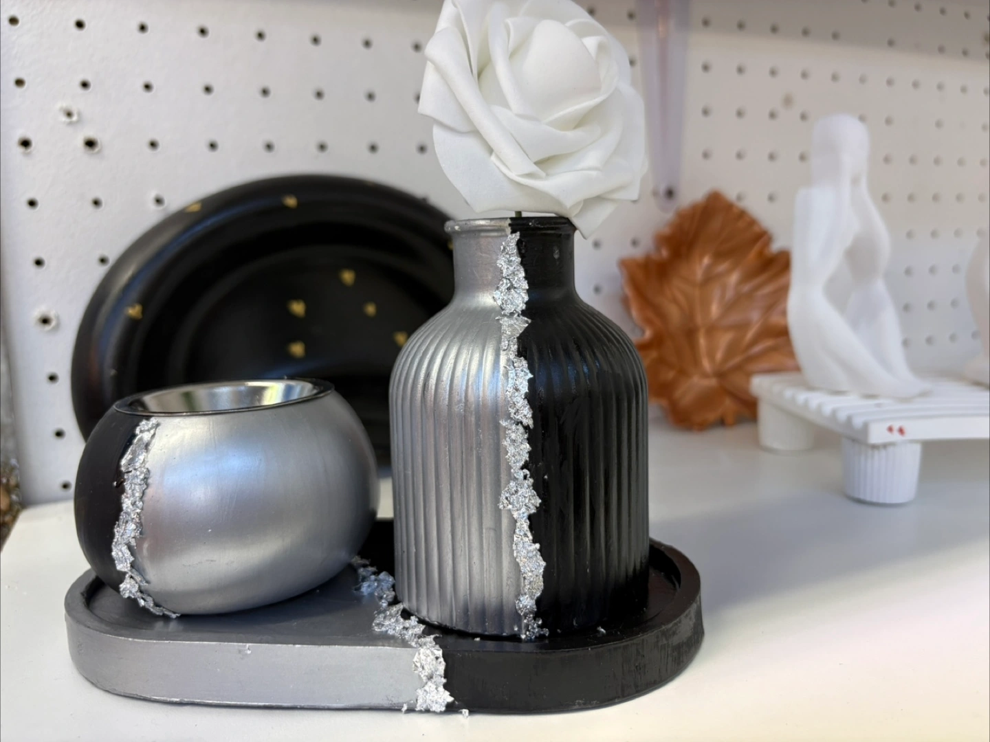 Elevate your home décor with this unique and versatile handmade Jesmonite set (tray, vase and intense burner or box) black and silver. This striking piece features a modern design with a contrasting black and silver finish, adding a touch of contemporary elegance to any space.