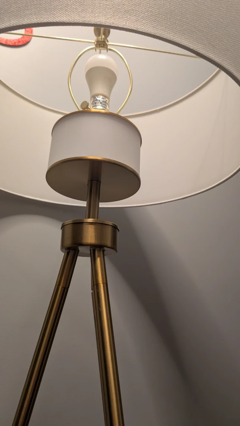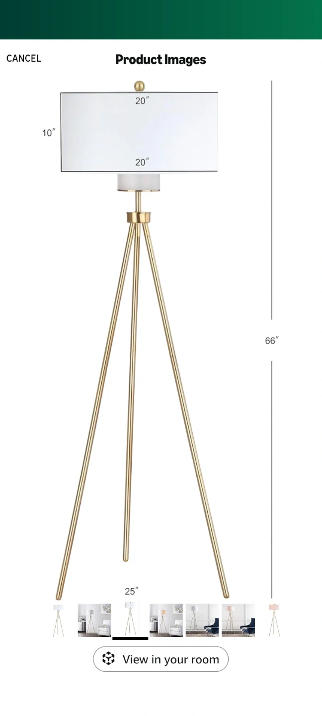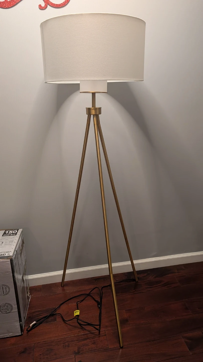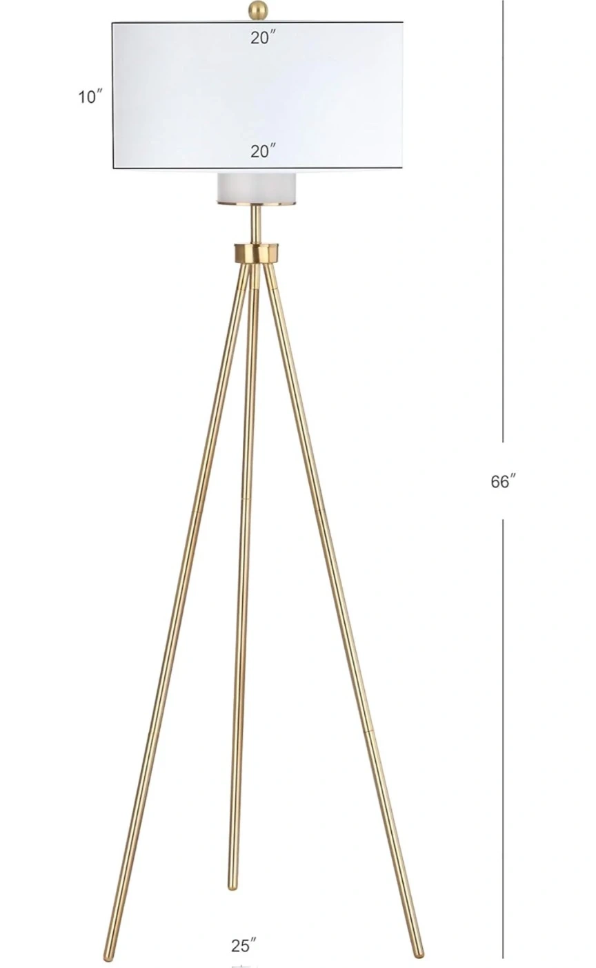 Selling a stylish gold tripod floor lamp! It stands 66 inches tall and has a shade that's 10 inches high and 20 inches wide. Perfect for adding a touch of modern elegance to any room
