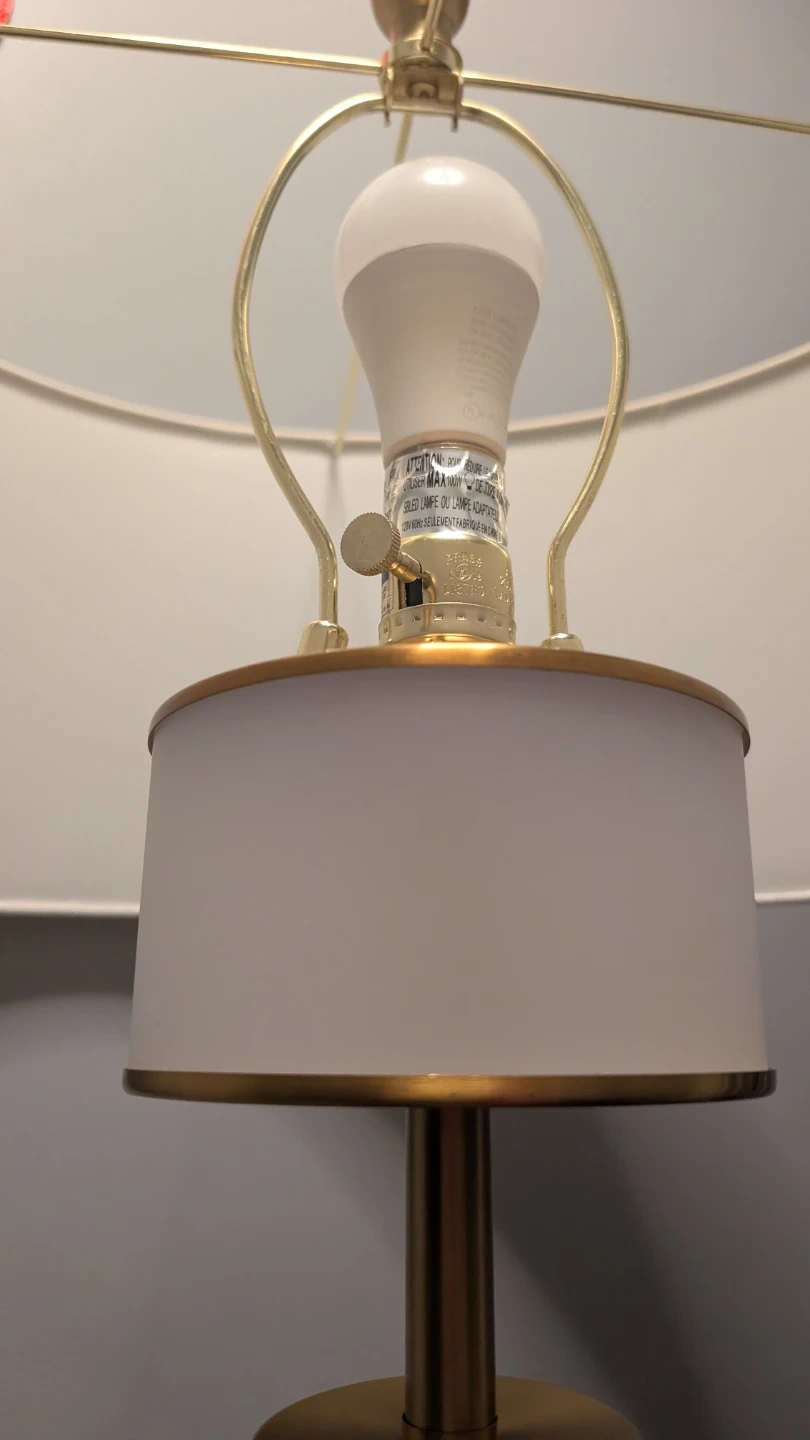 Selling a stylish gold tripod floor lamp! It stands 66 inches tall and has a shade that's 10 inches high and 20 inches wide. Perfect for adding a touch of modern elegance to any room