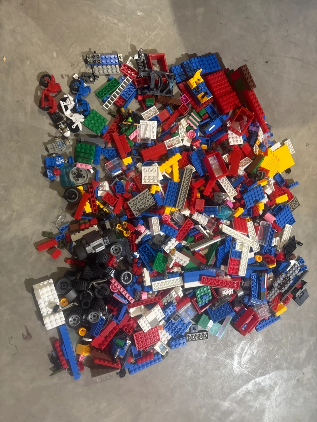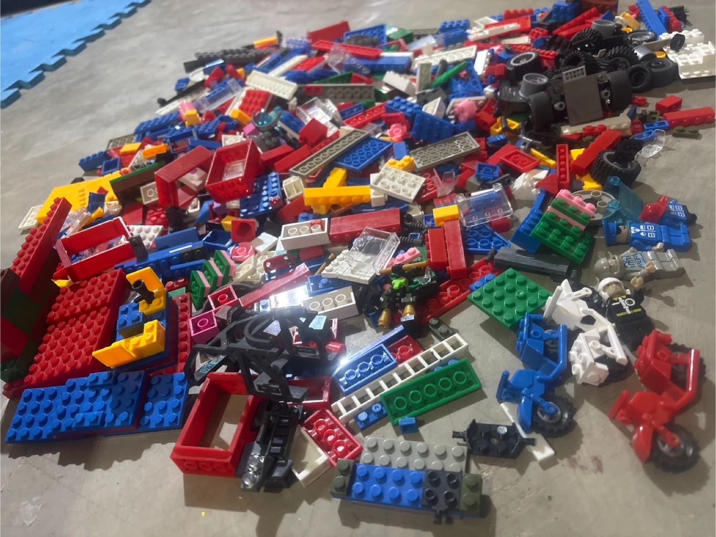 A large collection of assorted knockoff LEGO building blocks. Includes various bricks, wheels, figures, and accessories for creative building. Great for all ages to construct different models!