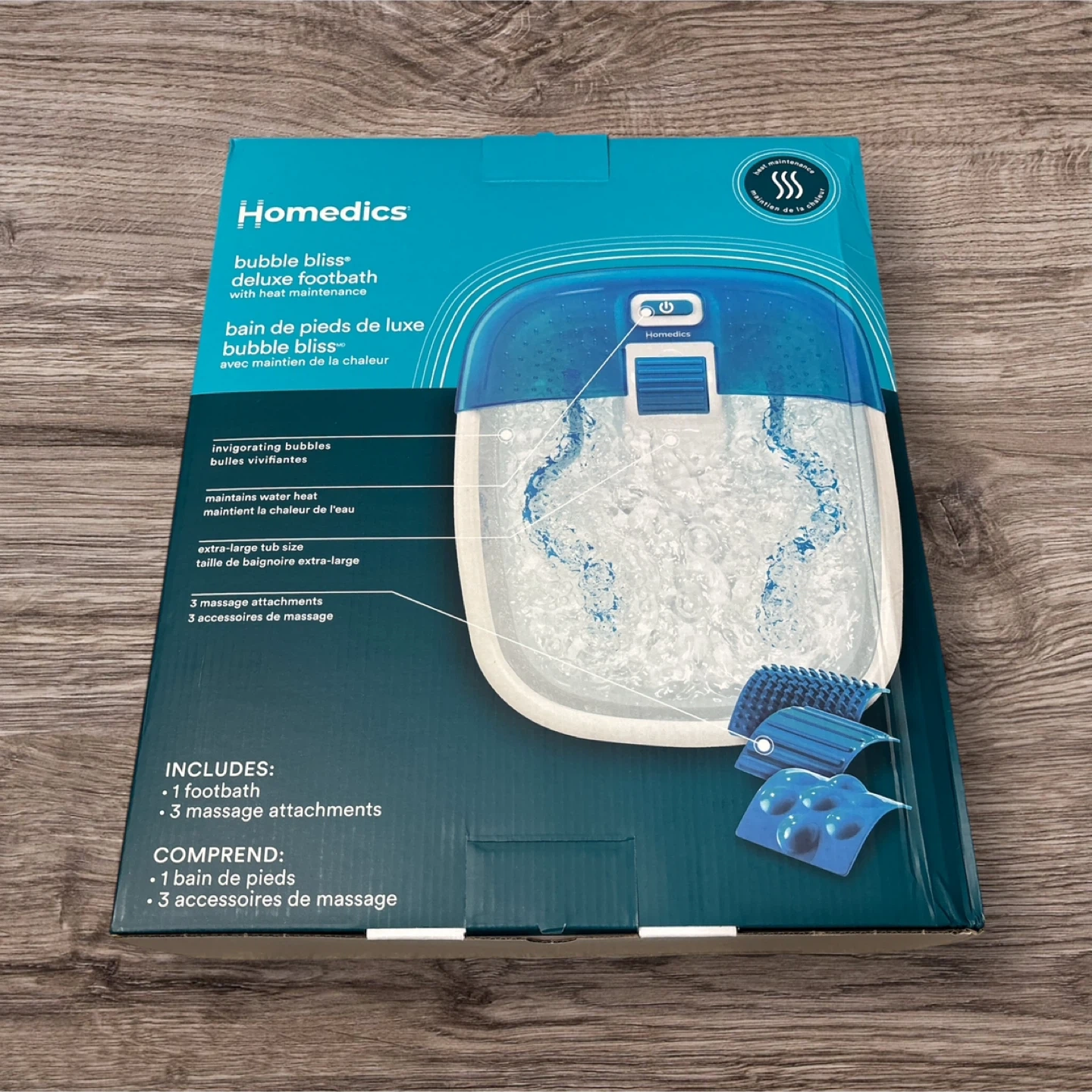 Relax and refresh your feet with the Homedics Bubble Bliss Deluxe Footbath. This unit is brand new and unused — the box was opened only for inspection. The product has never been used and is in perfect working condition.