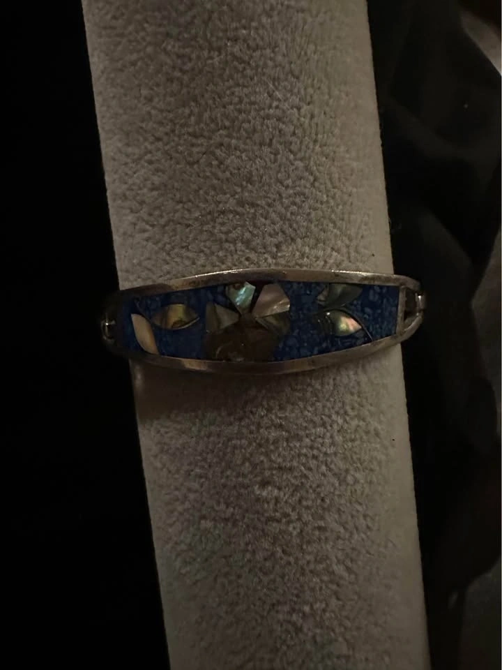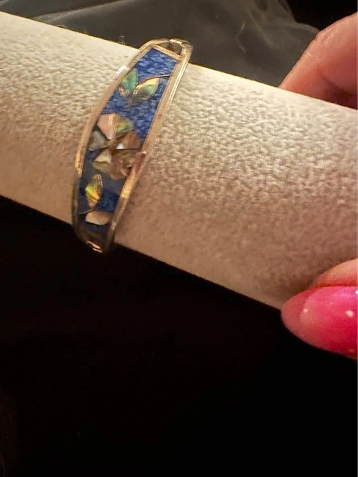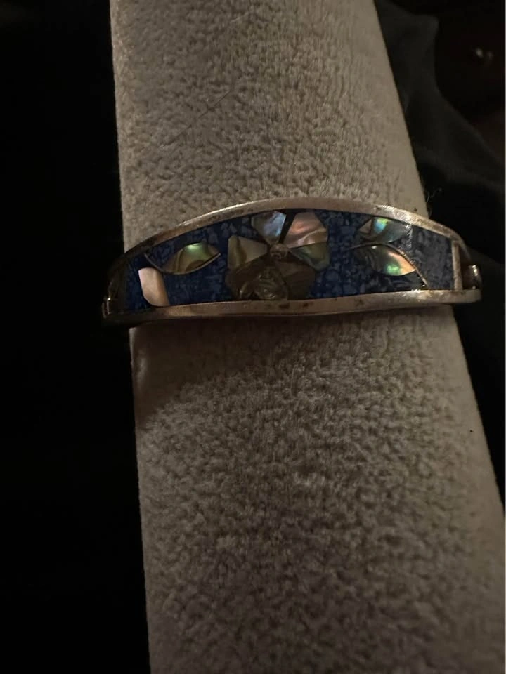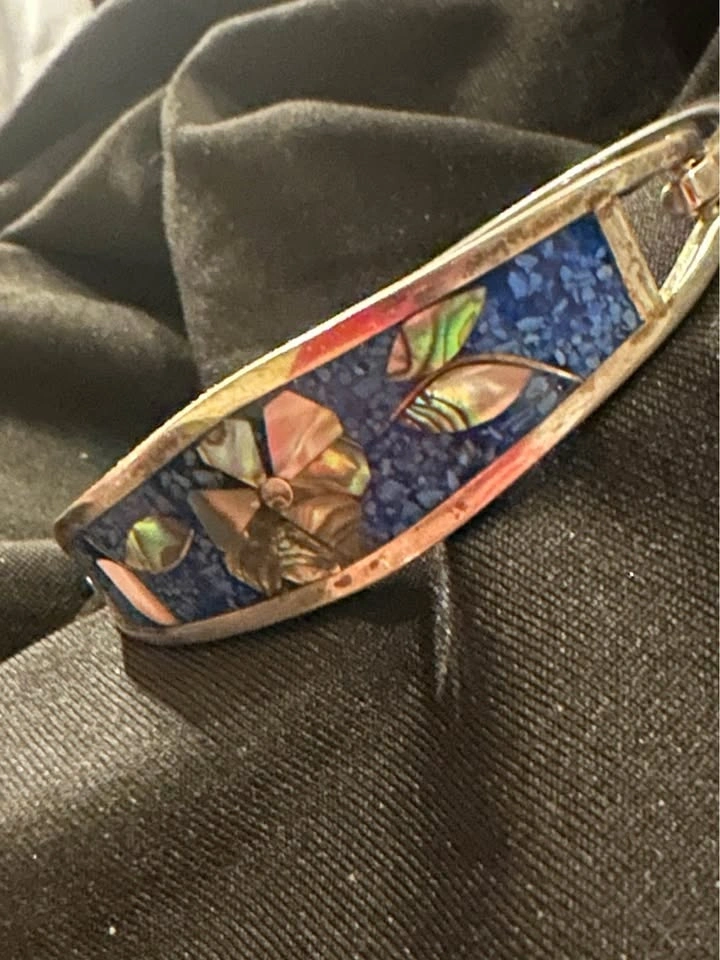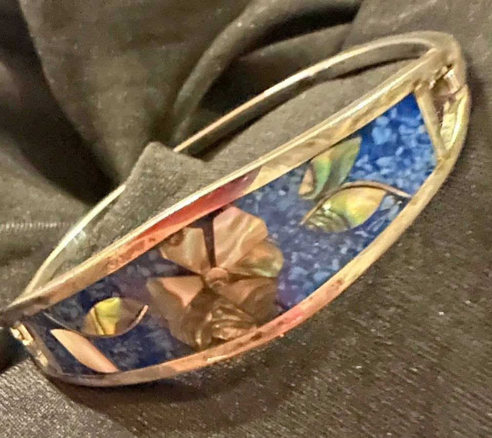 Vintage Flower Motif Silver Tone Mother of Pearl Inlay Blue Enamel Alpaca Mexico Hinged Tension Cuff Bracelet.
