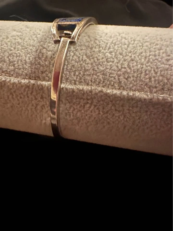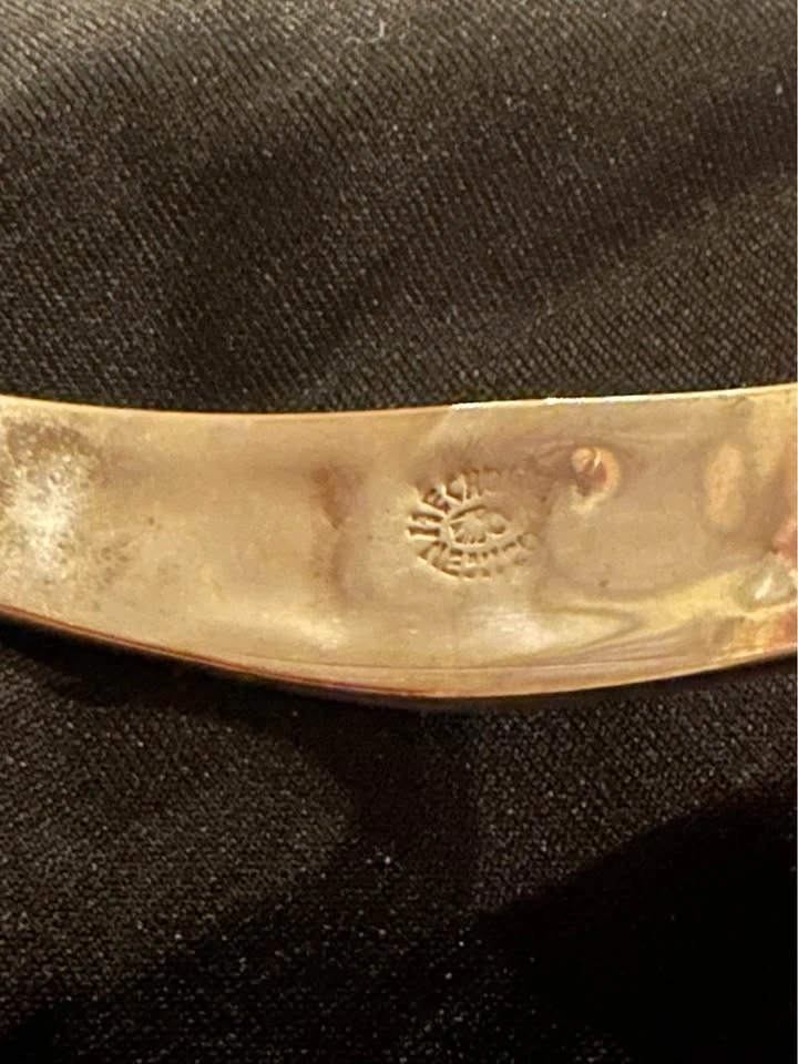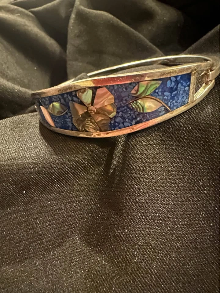 Vintage Flower Motif Silver Tone Mother of Pearl Inlay Blue Enamel Alpaca Mexico Hinged Tension Cuff Bracelet.