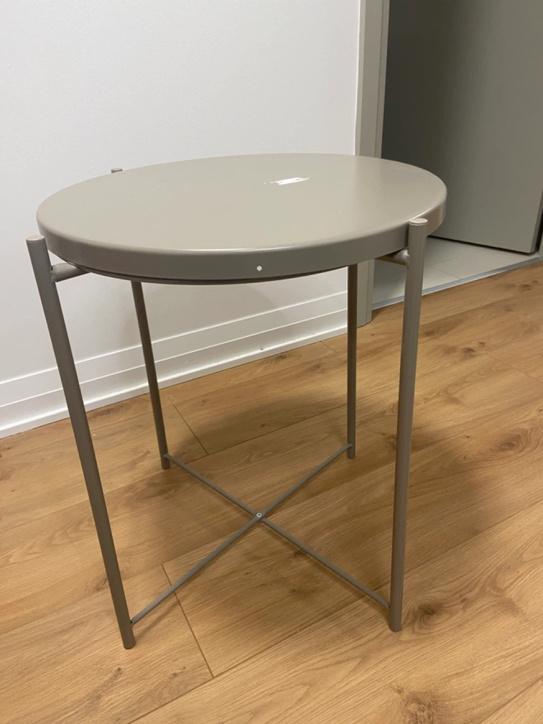 Selling a simple round metal side table. It's in great shape and would be perfect next to a couch or bed. The colour is a neutral grey.