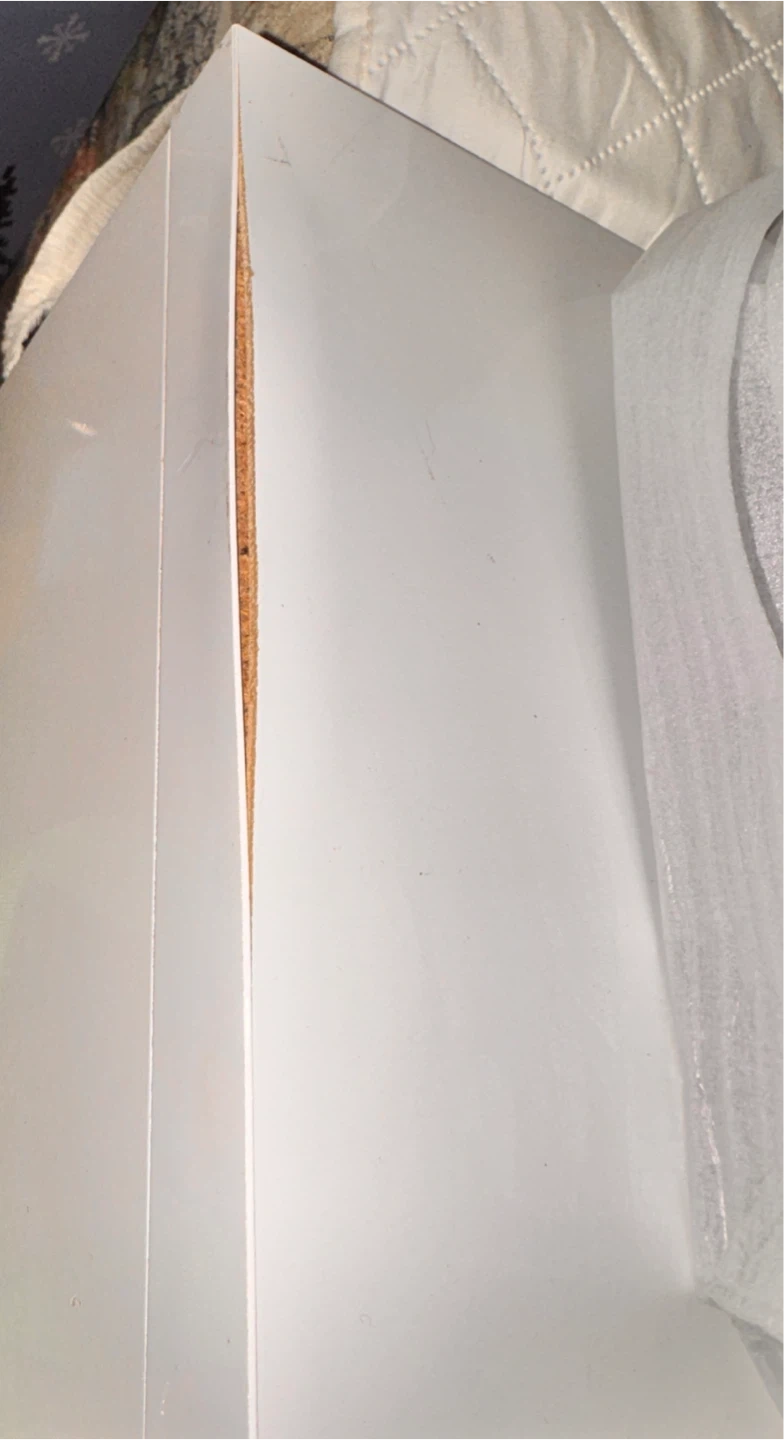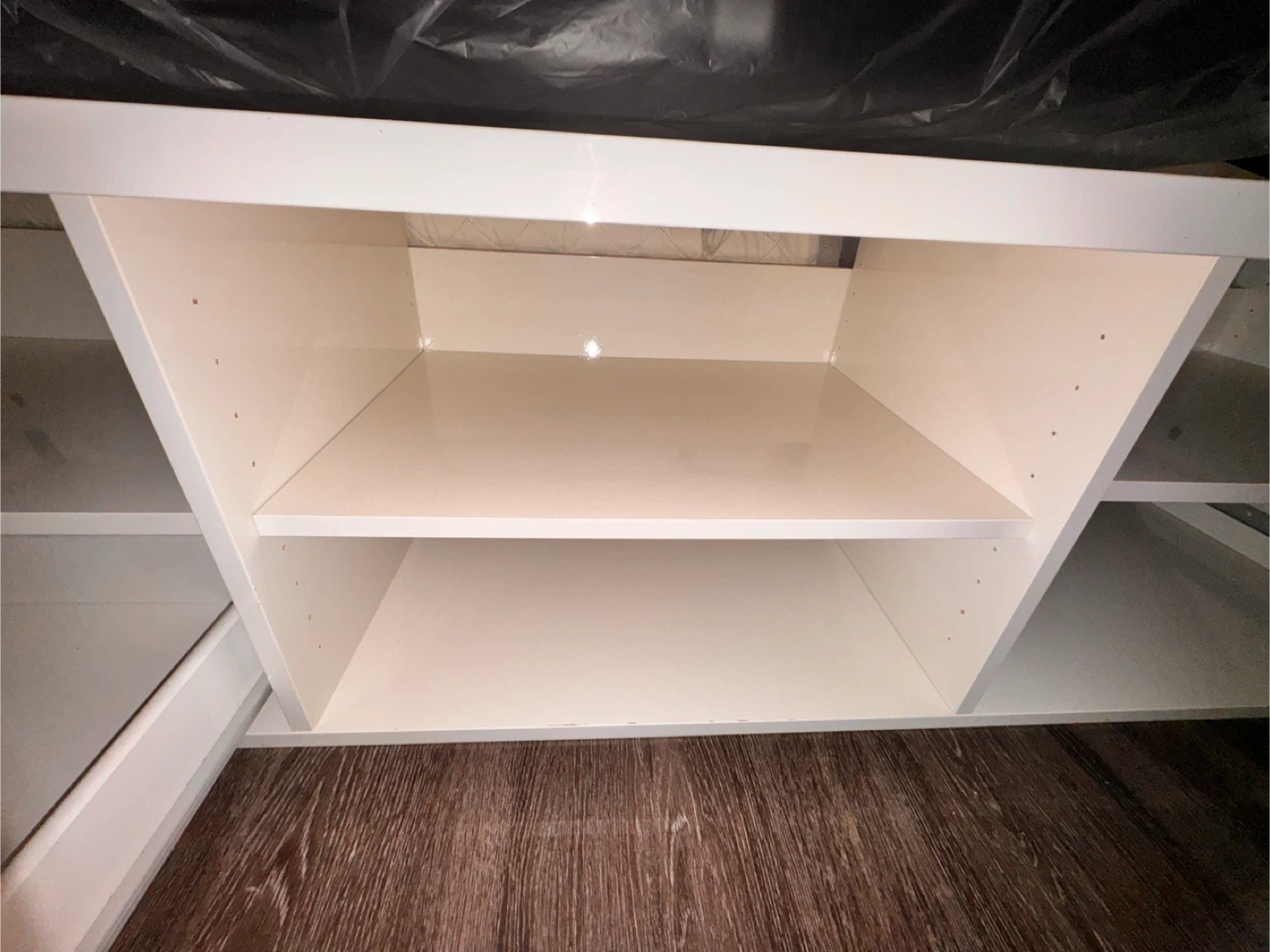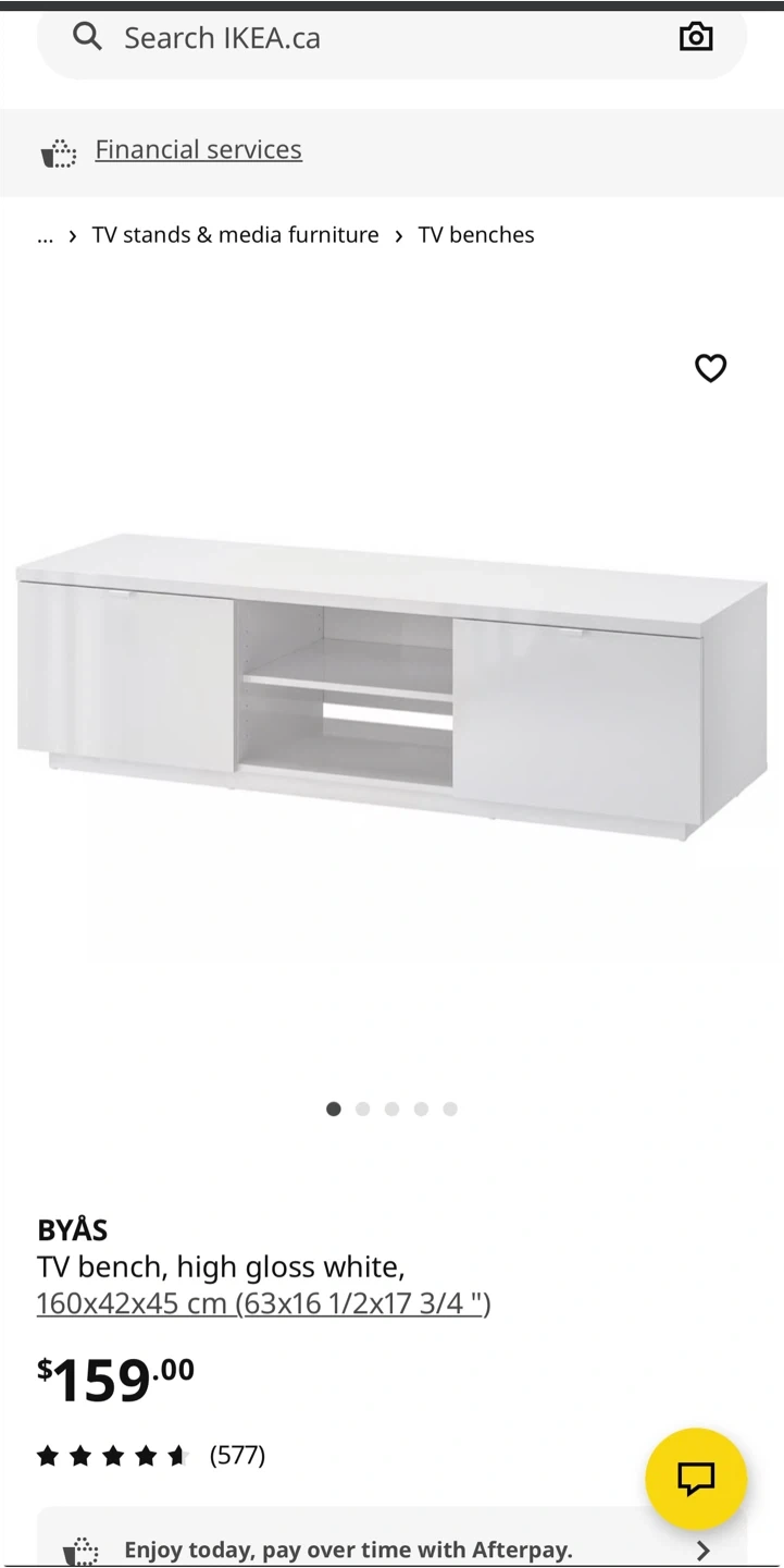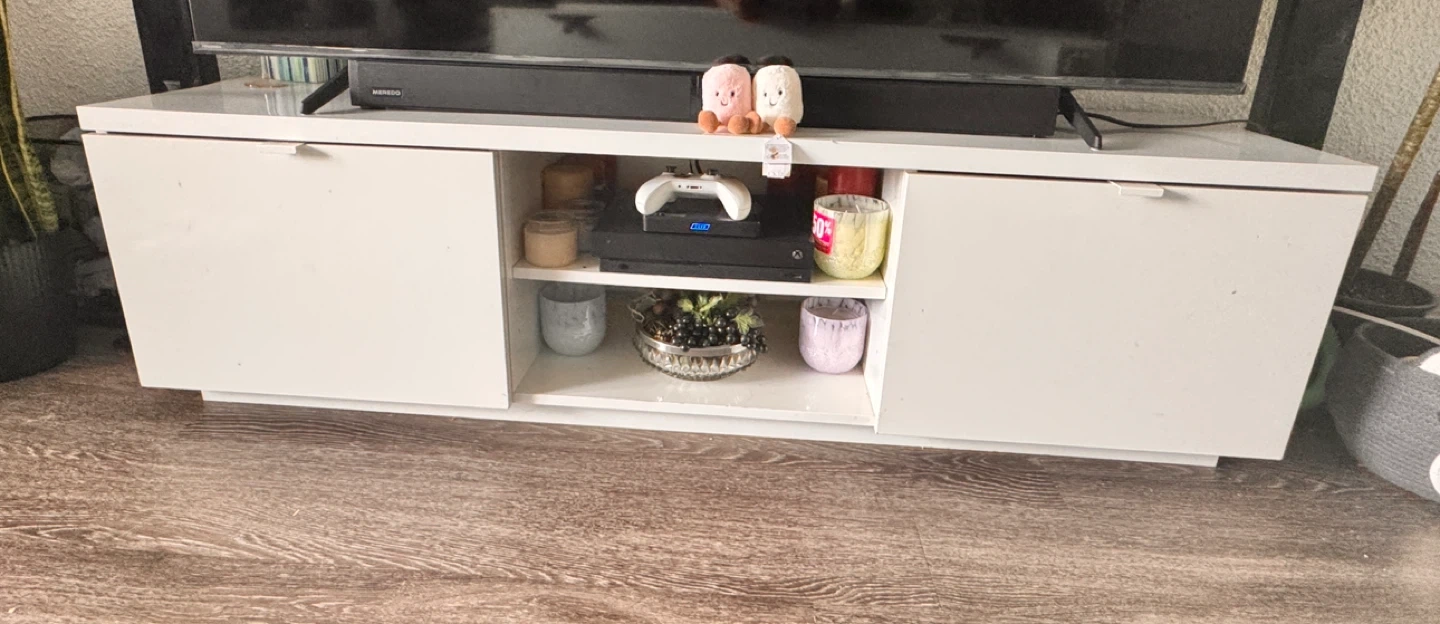 Glossy white IKEA BYÅS TV bench. Has two cabinets with sliding doors and open shelves in the middle. Measures 160x42x45 cm. There's some damage on one of the edges, it’s not visible that much otherwise it’s all clean and good condition, perfectly assembled as you can see on the picture ,a split in the material. Still works great for your TV and media stuff.