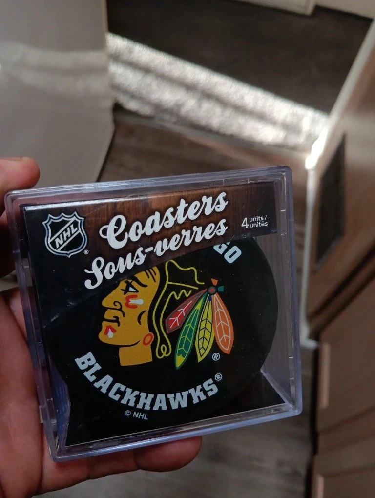 The object in the image is a Chicago Blackhawks souvenir hockey puck, which may also be part of a set of coasters.