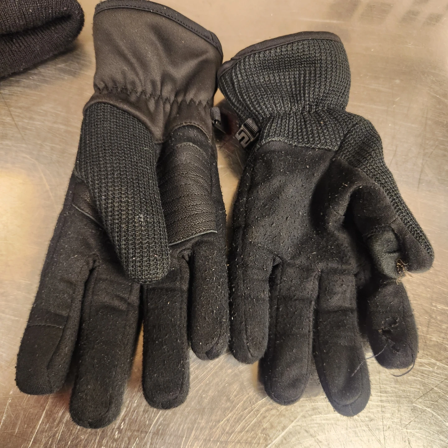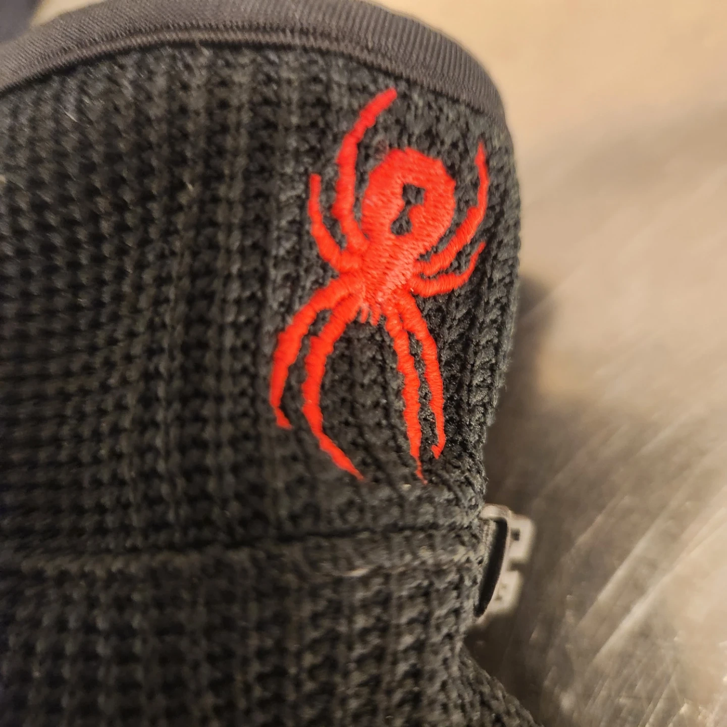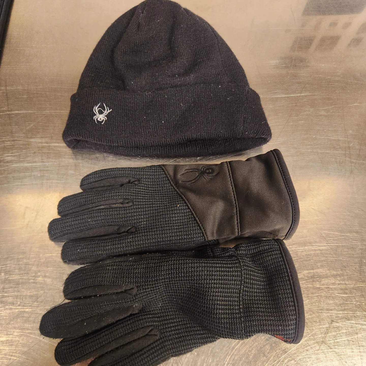 πŸ₯• This is a set of black Spyder gloves and a matching beanie. The gloves feature a textured palm for grip and a knitted back. The beanie is made of a knitted material. The thumb on the left hand glove needs sticking but you can wear it as it is too.