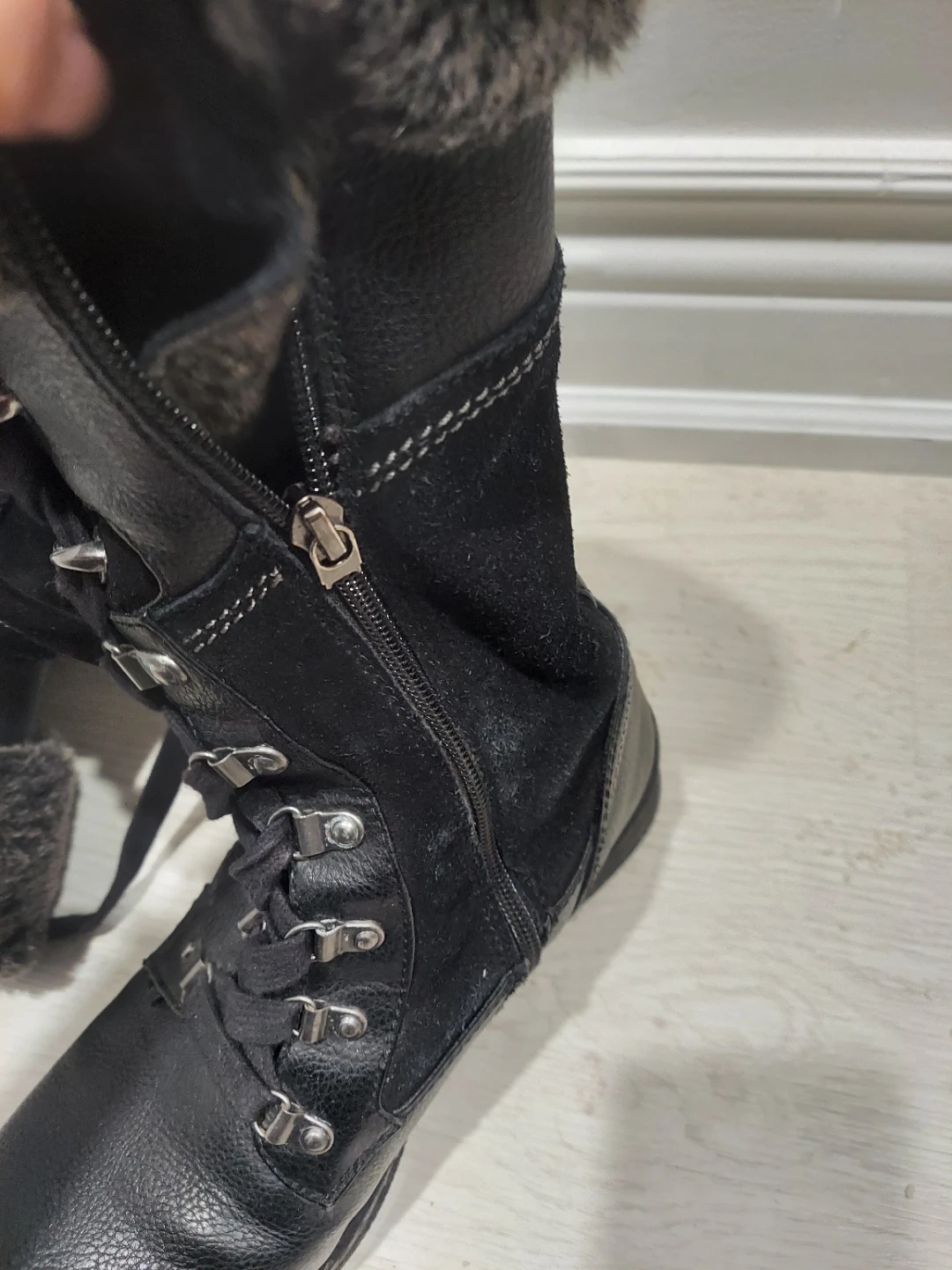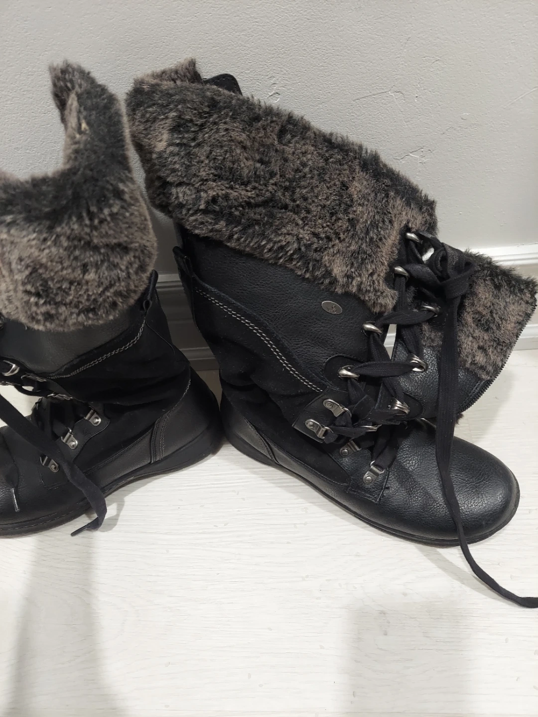 Comfortable black winter boots with faux fur trim. These boots feature a side zipper and lace-up front for a secure fit. Perfect for keeping your feet warm and dry during colder months!