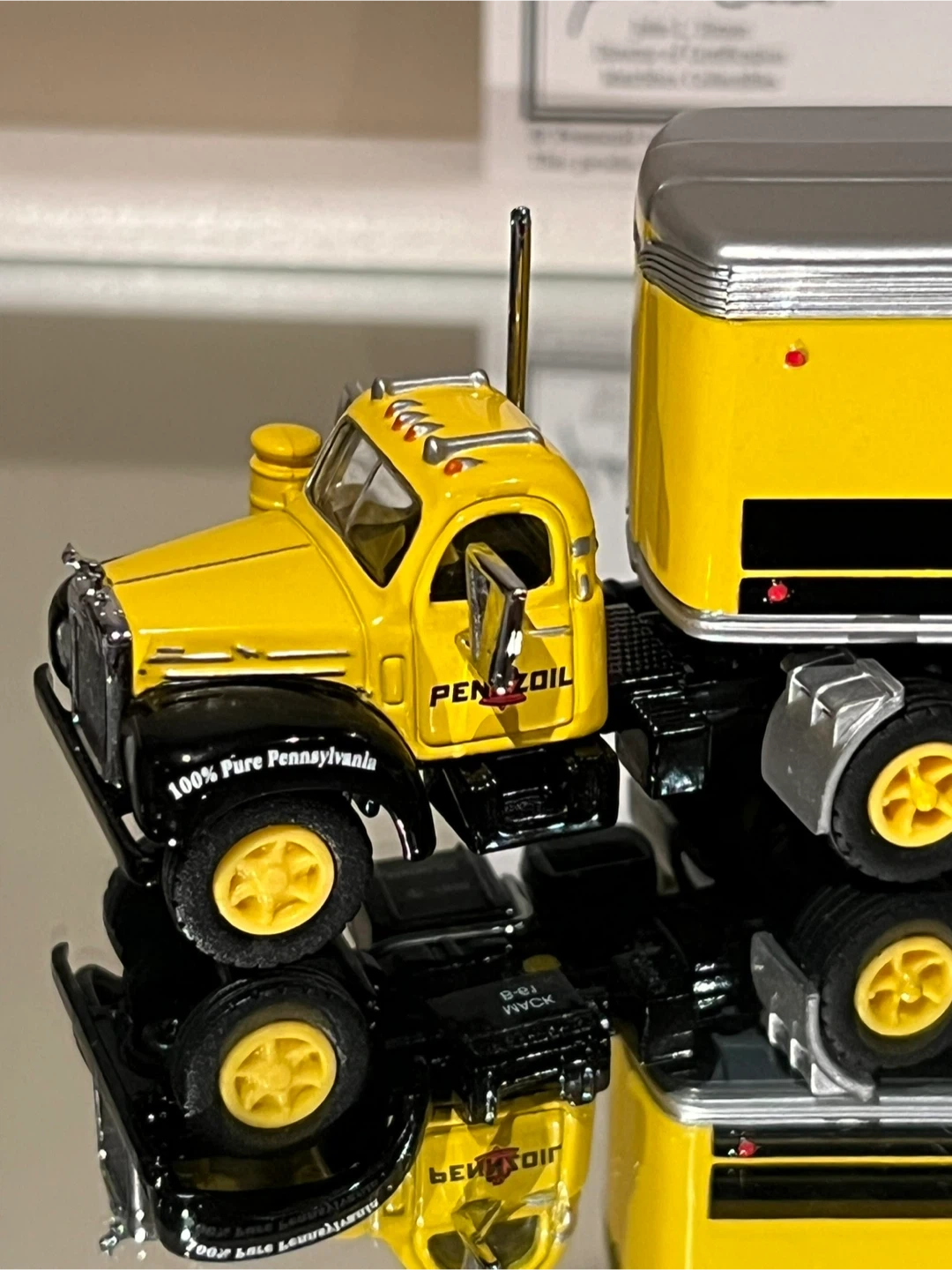 This is a NEW die-cast model replica of the Pennzoil 1956 Mack B61 tractor trailer. It's detailed with yellow, black, and silver colouring, and features the Pennzoil logo and branding. Includes a certificate of authenticity.