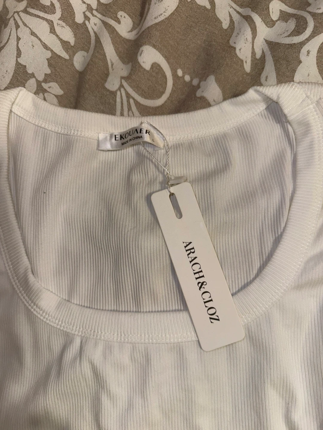 Simple white ribbed long sleeve top. It's made of a comfortable stretch fabric. This top is great for layering or wearing on its own! Never worn, its tag is still attached.