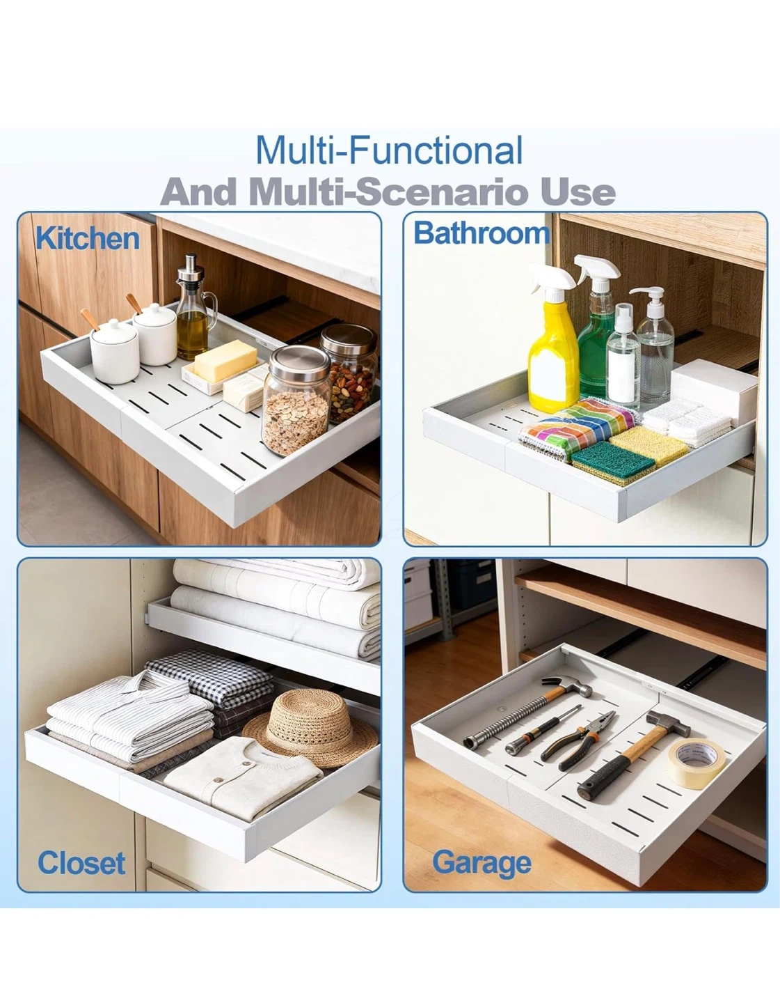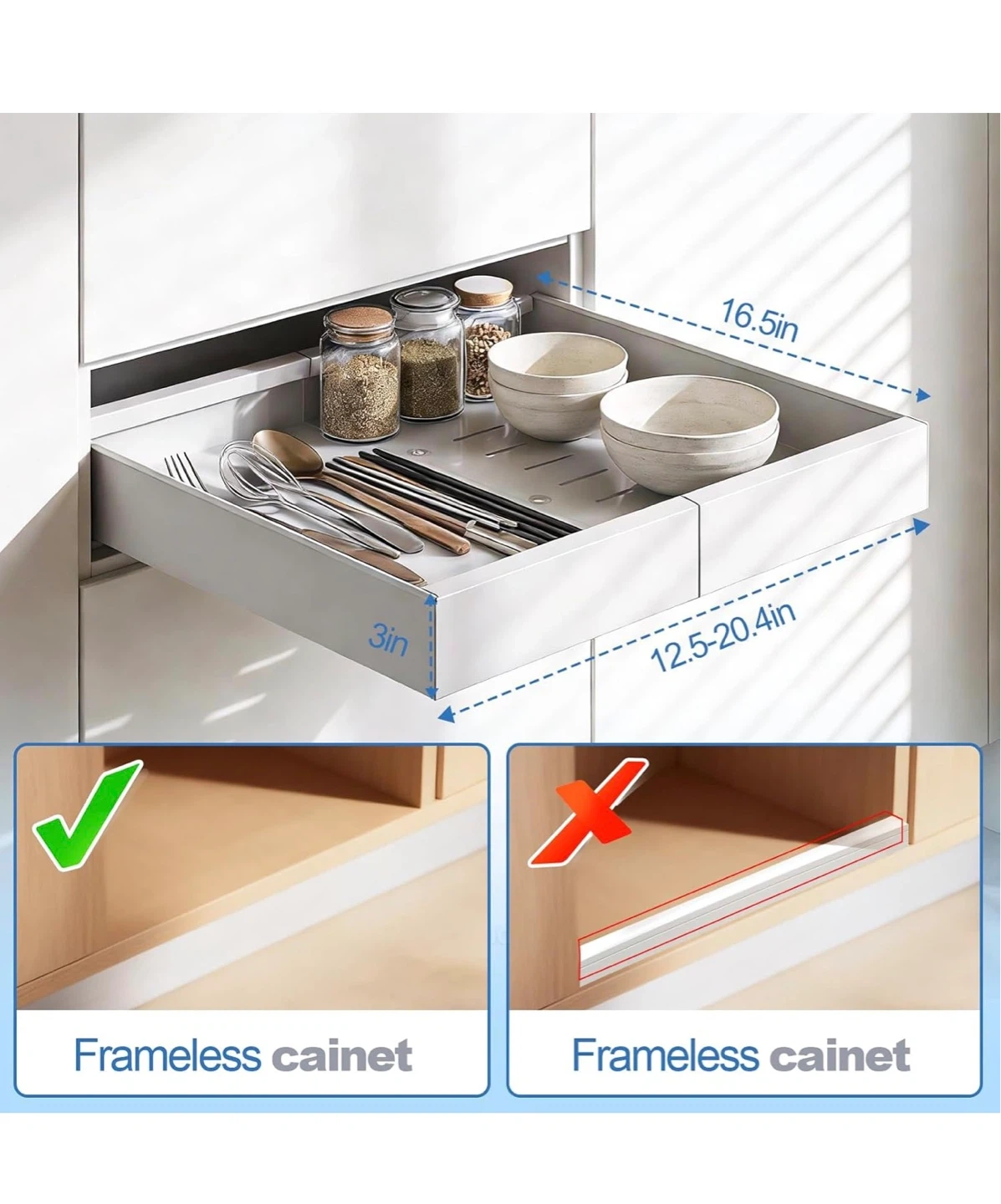 These organizers offer multi-functional use in kitchens, bathrooms, closets, and garages. They feature 3 slide rails for smooth operation. The adjustable width fits openings from 12 inches to 20.4 inches.