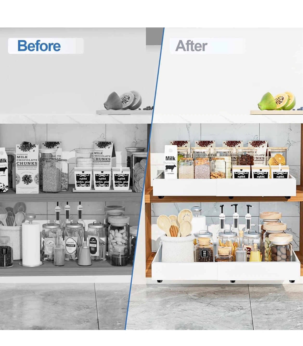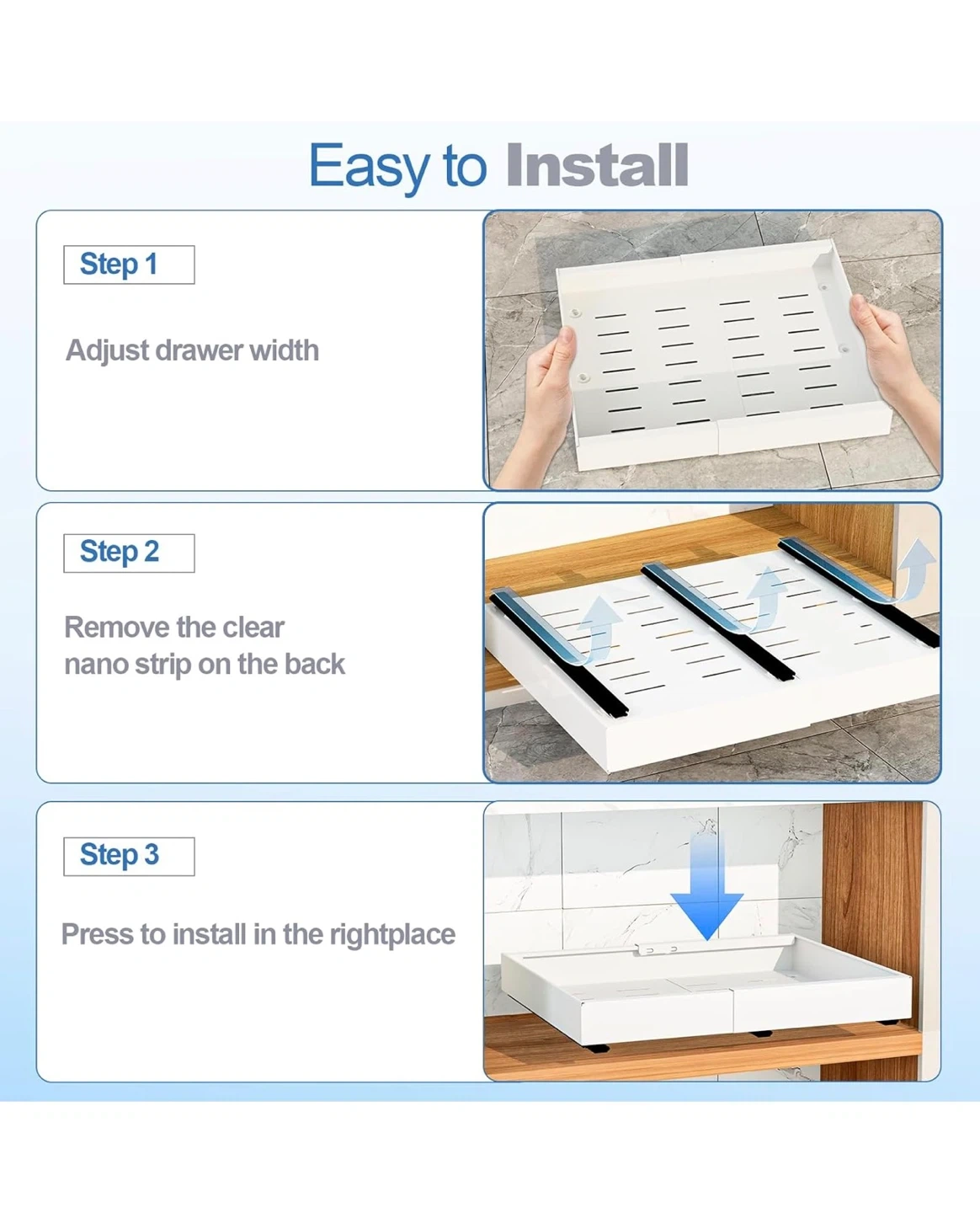 These organizers offer multi-functional use in kitchens, bathrooms, closets, and garages. They feature 3 slide rails for smooth operation. The adjustable width fits openings from 12 inches to 20.4 inches.