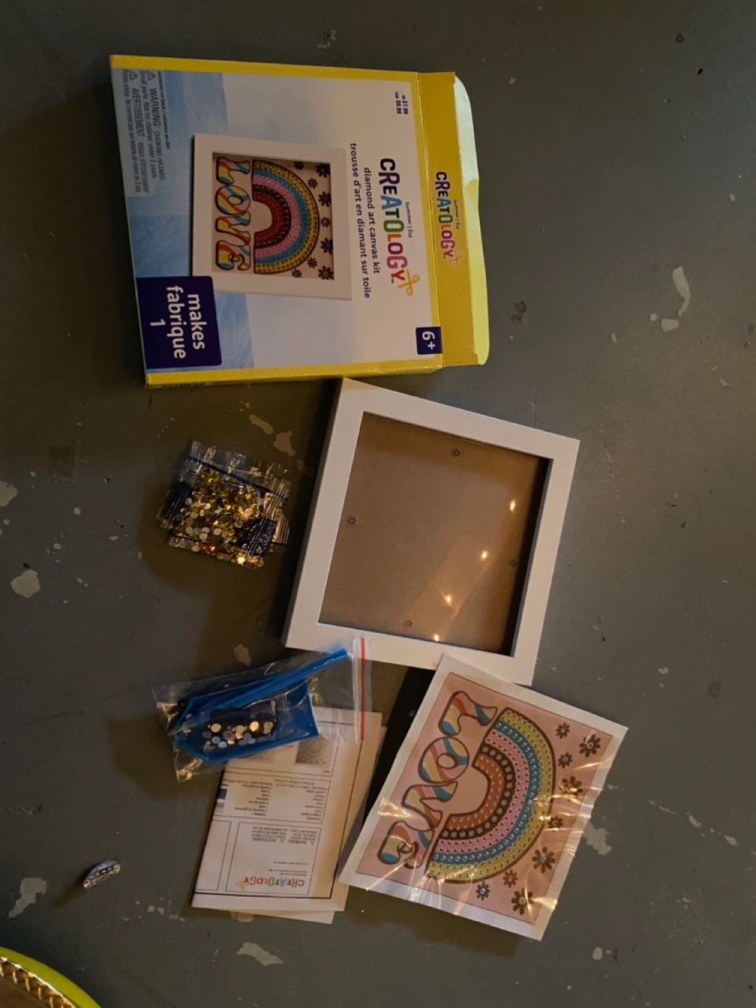 This is a Creatology diamond art canvas kit featuring a LOVE rainbow design. It includes the canvas, frame, and all the diamond beads needed to complete the project. Suitable for ages 6 and up!