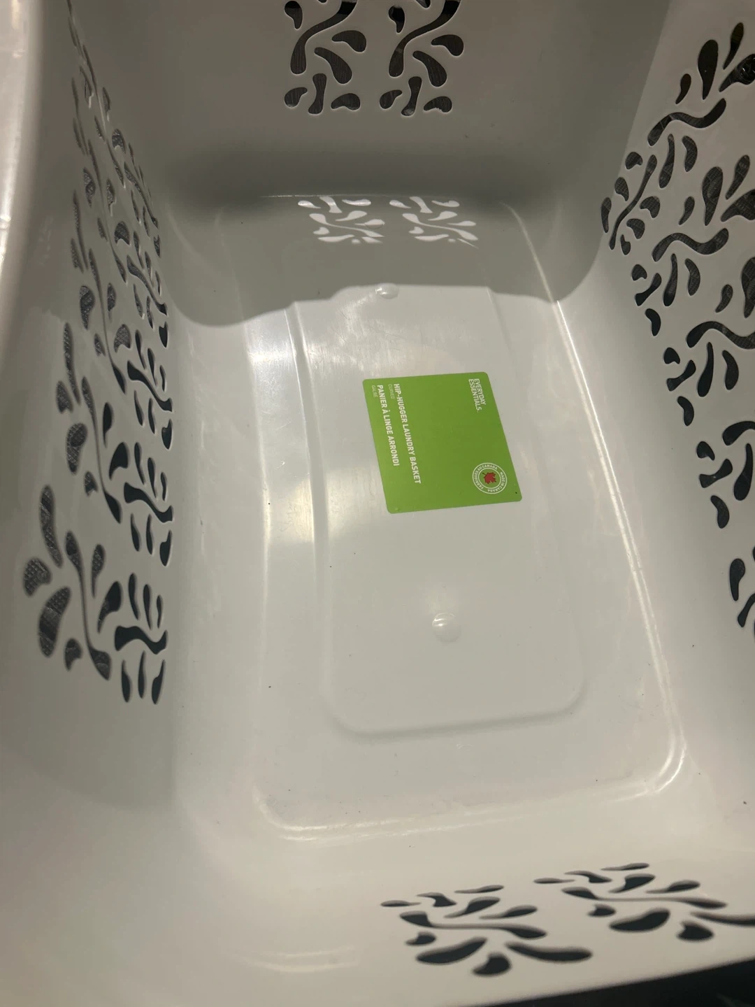 This is a Hip-Hold Laundry Basket in Mindful Mint. It has a capacity of 44 L. The basket measures 26.38" L x 18.11" W x 10" H. It's made of plastic with decorative cutouts.
