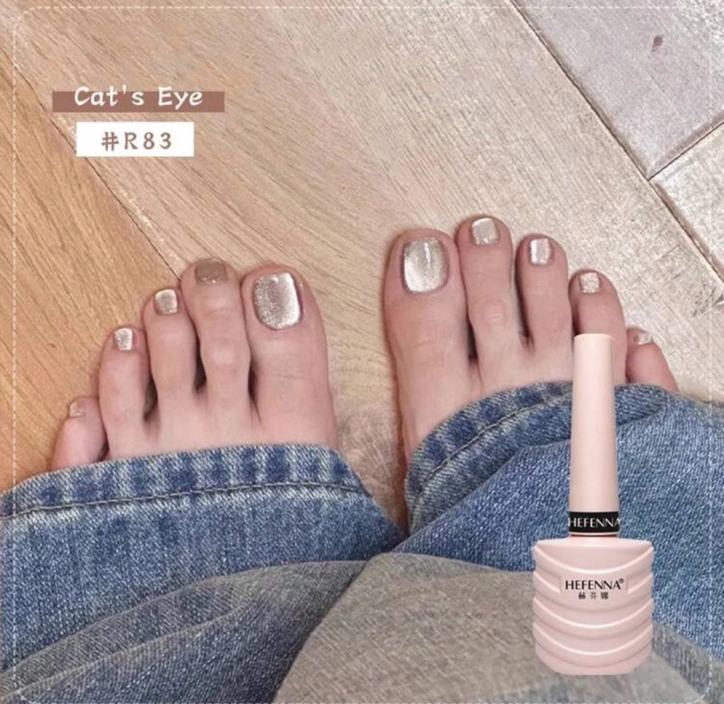 Set of cat eye gel polish, a UV lamp, and other accessories for nail design. Includes base and top coat, a jar of glitter, and nail tools.
